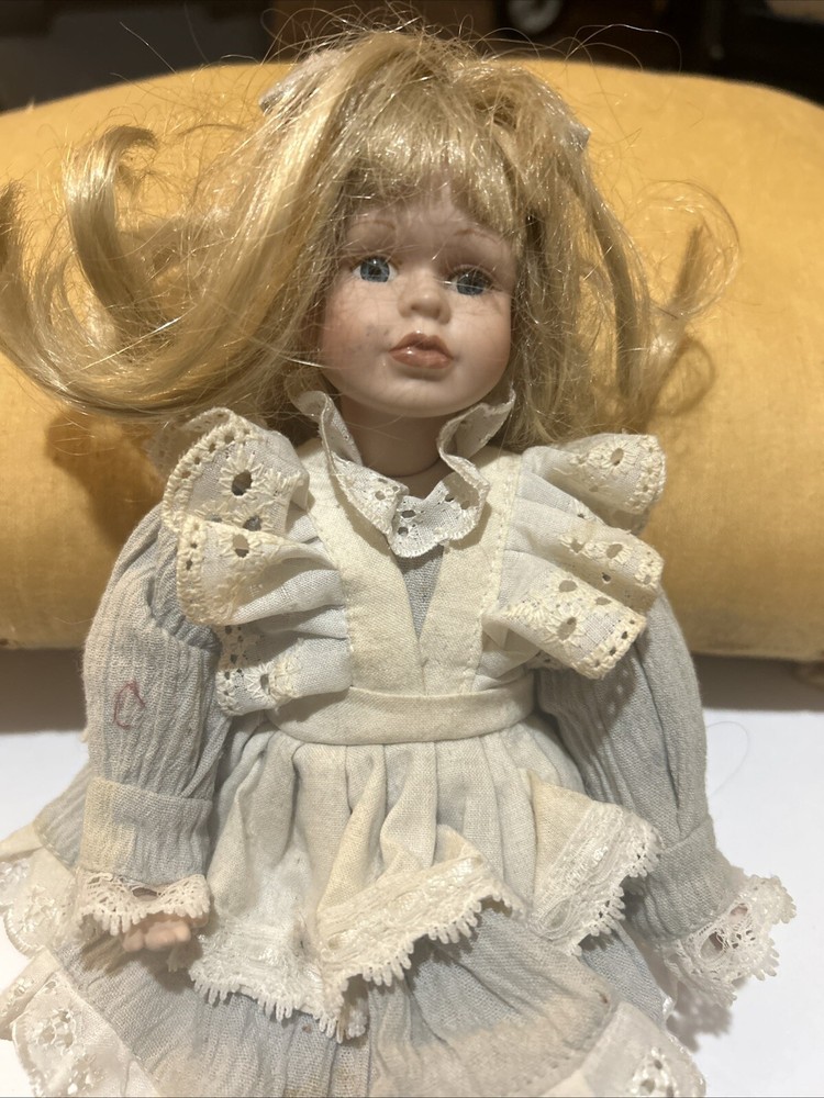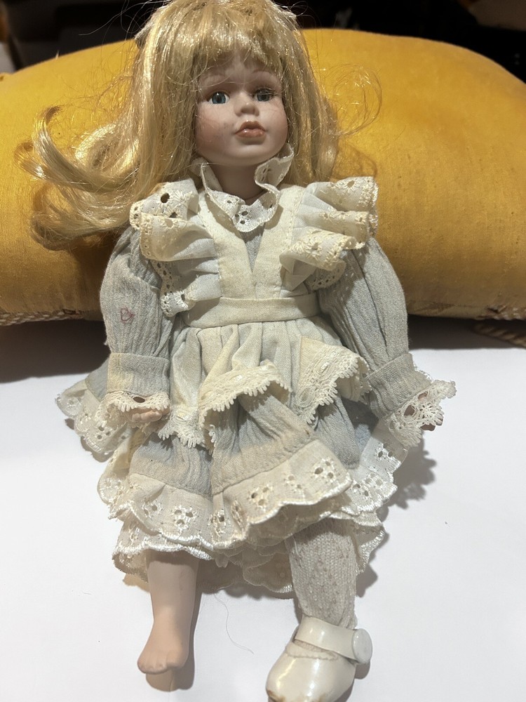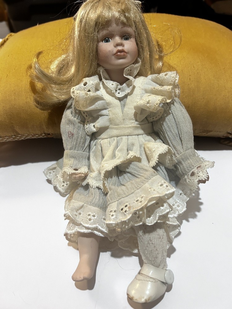 This cute little doll is missing one of her shoes and suck. Her dress. Looks like it is yellowed with age. Her hair is a little messy that could just be moved out of her face. She has some fantastic curl to it. She needs some TLC. Her bow is on her head and she assigned that her clothes could be washed.