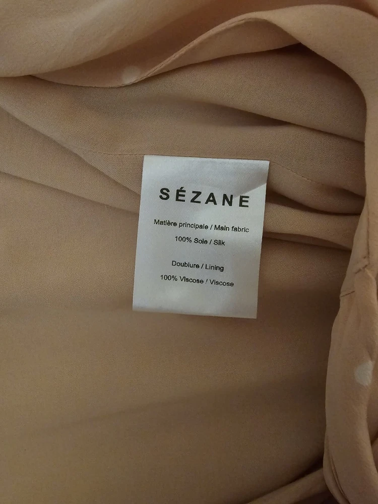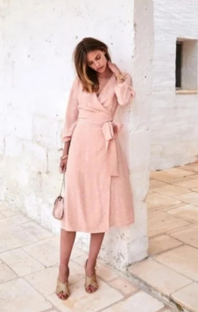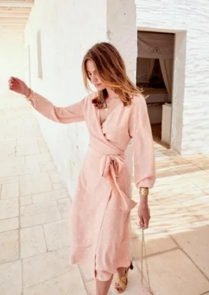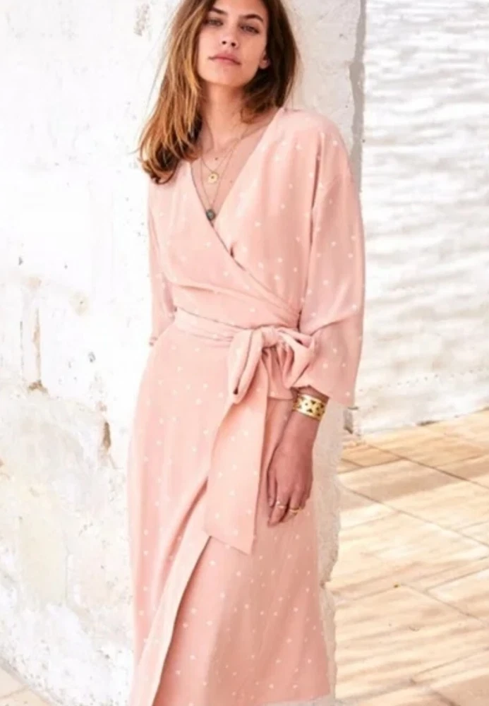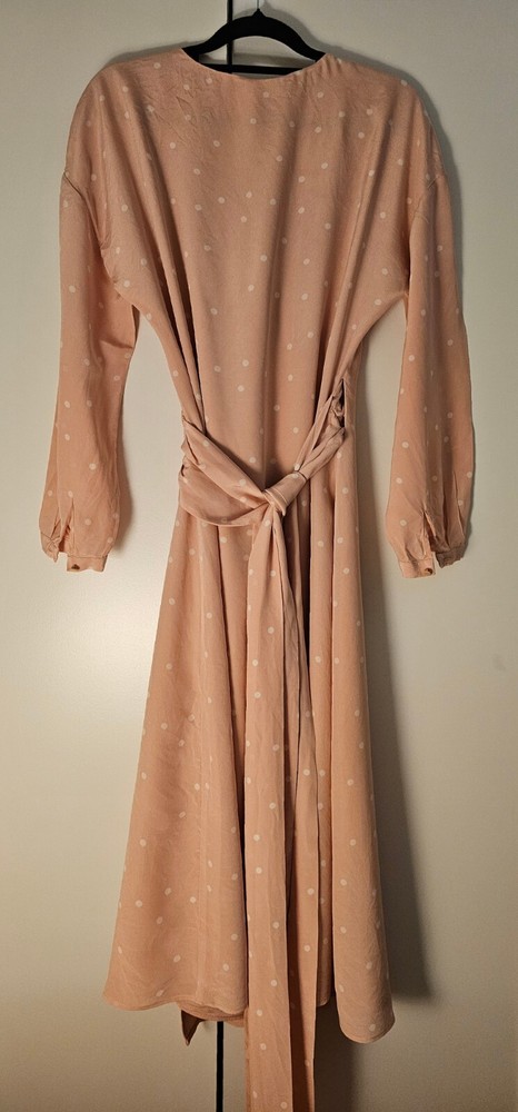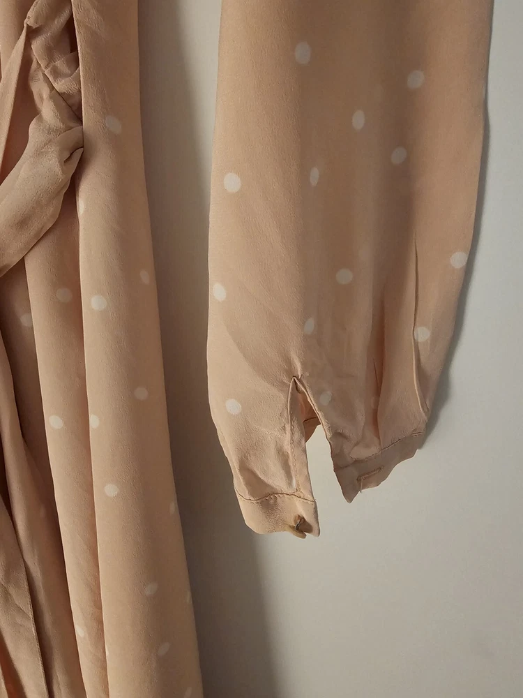 Pre-Owned. Gently used. Only used for ocassions so far but can be worn on any day. Lovely sweet peachy pink base colour with white polka dots. Midi length on me (I'm about 165cm tall). I usually wear AU/UK10 in clothes and this fits ok. - Size 38 - 100% silk - slit and button detail on sleeves - lined