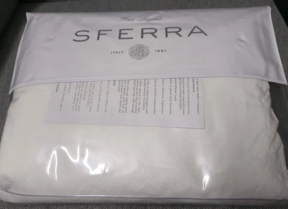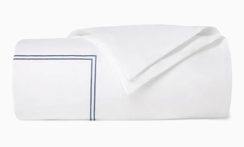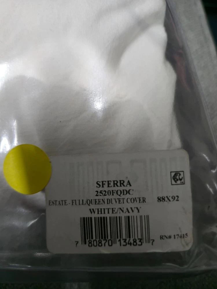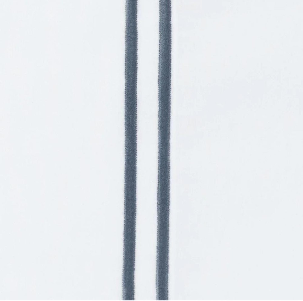 The Sferra Estate Full/Queen Duvet White/Navy Applique Stripe Cover is a luxurious and stylish addition to any bedroom. Made in Italy from 100% Italian spun long staple cotton percale, this duvet cover features a sateen applique navy blue stripe pattern on a white background. It has a transitional style with a plain hem and end ties, adding a touch of elegance to the design. With a thread count of 201-400 and 3 extra buttons for closure, this duvet cover is both machine washable and reversible, making it a versatile and high-quality choice for adults.