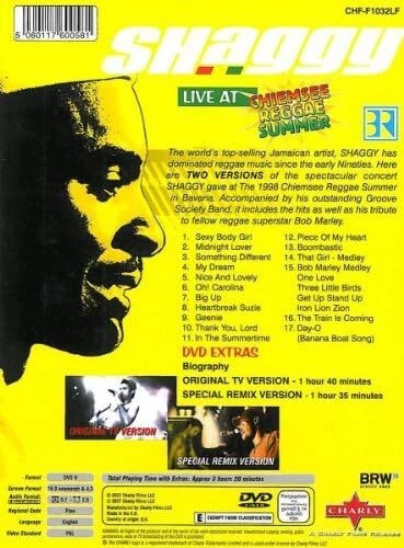 Further Details Title: Shaggy Live Format: DVD Condition: New Number Of Discs: 1 Actors: Shaggy Audio Language: English Runtime: 3 hours and 17 minutes Region Code: DVD: 2 (Europe, Japan, Middle East...) Studio: Liberation Entertainment Description: The Jamaican superstar accompanied by the 'Groove Society Band', headlining the 1998 Chiemsee Reggae Festival; a prestigious reggae event held annually in the Bavarian Alps. The set includes his hits 'Boombastic' and 'Oh Carolina'. DVDs ARE REGION 1 UNLESS OTHERWISE STATED Missing Information? Please contact us if any details are missing and where possible we will add the information to our listing.