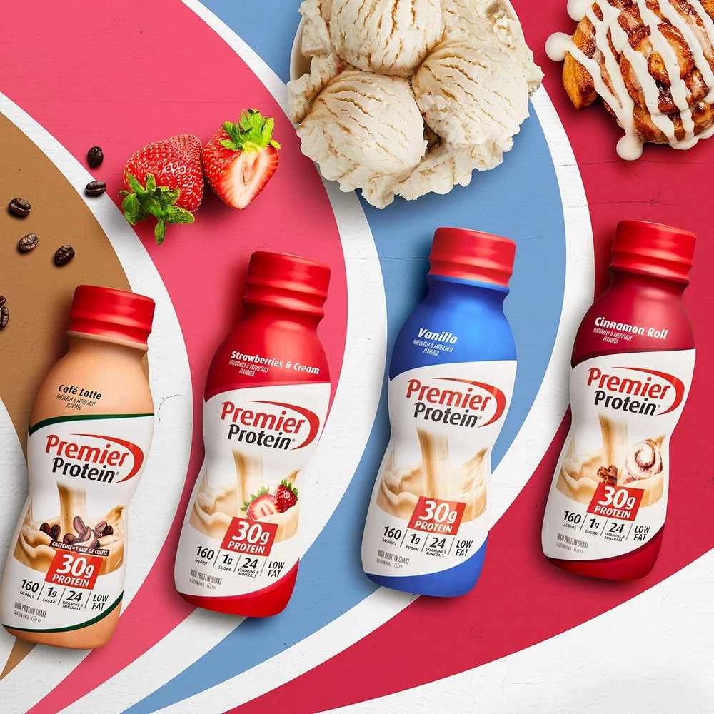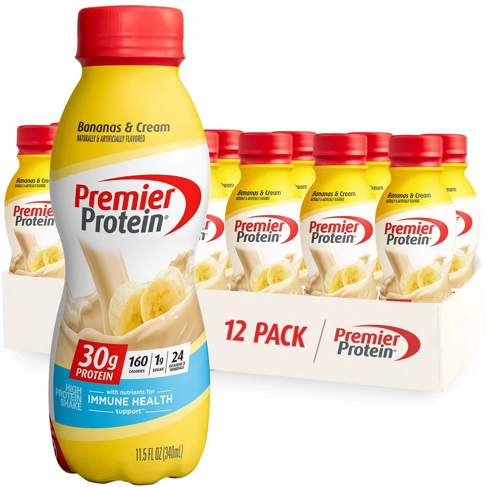 Enjoy the deliciously smooth bananas and cream flavor; Winner of American Masters of Taste Gold Medal for SUPERIOR TASTING ready-to-drink protein beverages. 30g of protein to help curb your hunger, as a mid-day snack or for post workout recovery; includes all essential amino acids 24 Vitamins and Minerals: Support a healthy immune system as part of a healthy diet and lifestyle (Antioxidants Vitamins C and E plus Zinc), 50 percent daily value of calcium and 30 percent daily value of Vitamin D to help maintain healthy bones Guilt free indulgence: 1g Sugar, 4g Carbs, 160 Calories and Low Fat; Gluten Free, Keto and Bariatric Friendly, Kosher Try all eleven (11) delicious smooth and creamy flavors: Chocolate, Vanilla, Caramel, Cookies & Cream, Café Latte, Strawberries & Cream, Peaches & Cream, Bananas & Cream, Cinnamon Roll, Chocolate Peanut Butter and Cake Batter Packaged in a 11.5oz bottle, each Premier Protein Shake contains 30 grams of protein, complete with all the essential amino acids, 1g of sugar, 3-5g carbs (depending on flavor), 160 calories, 24 vitamins & minerals, and is also low in fat. We use a blend of milk protein and casein in our shakes to help fuel muscles quickly and for several hours to help support your goals. Enjoy a shake as a healthy snack, a breakfast on-the-go, an afternoon snack, or as pre- or post-workout fuel. They are delicious as is but are also highly customizable. Try blending with your favorite fruits and vegetables for a delicious smoothie or adding to cereal or oatmeal. Available in 11 delicious flavors: Chocolate, Vanilla, Cafe Latte, Caramel, Cookies & Cream, Strawberries & Cream, Bananas & Cream, Peaches & Cream, Cinnamon Roll, Chocolate Peanut Butter and Cake Batter Delight.