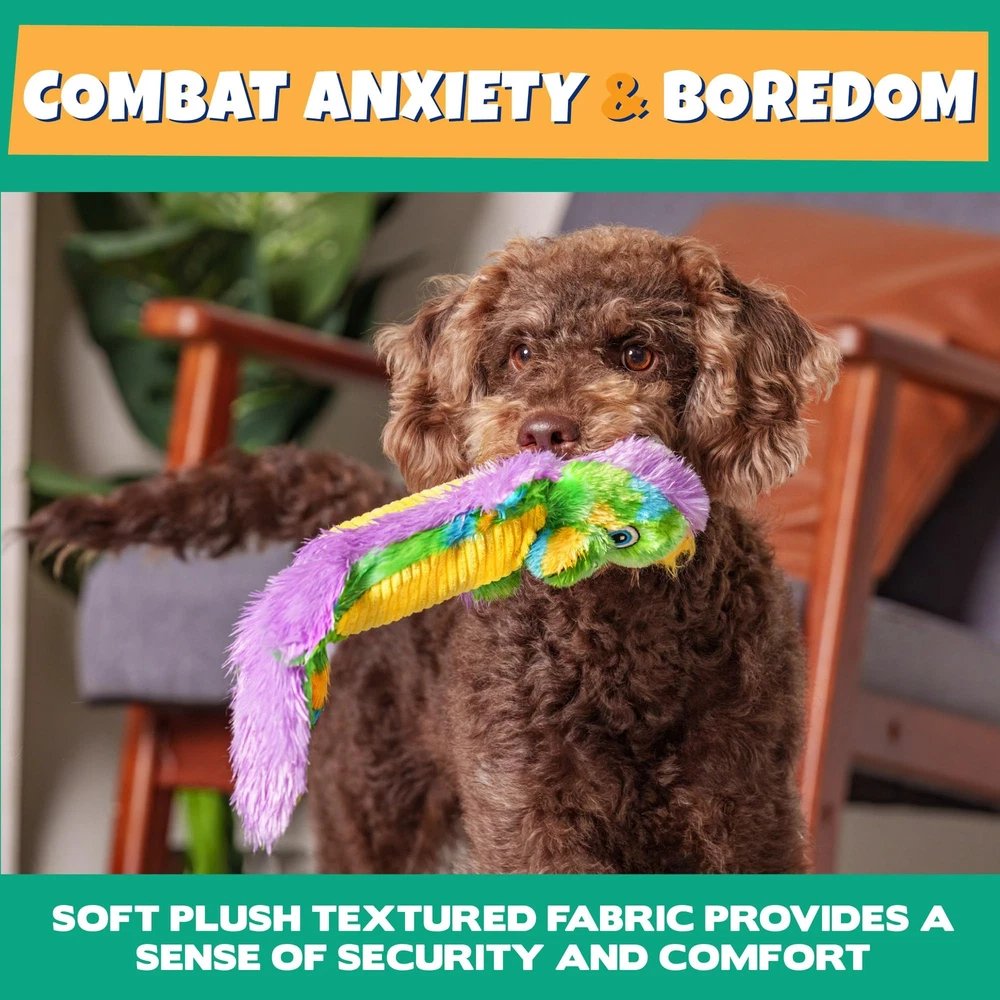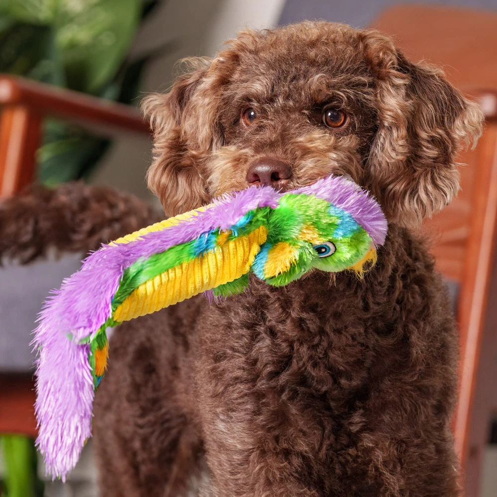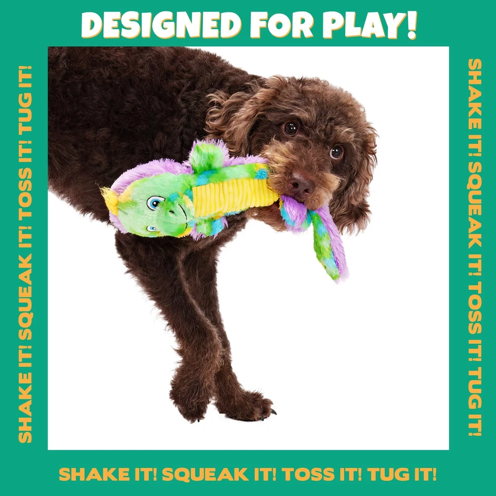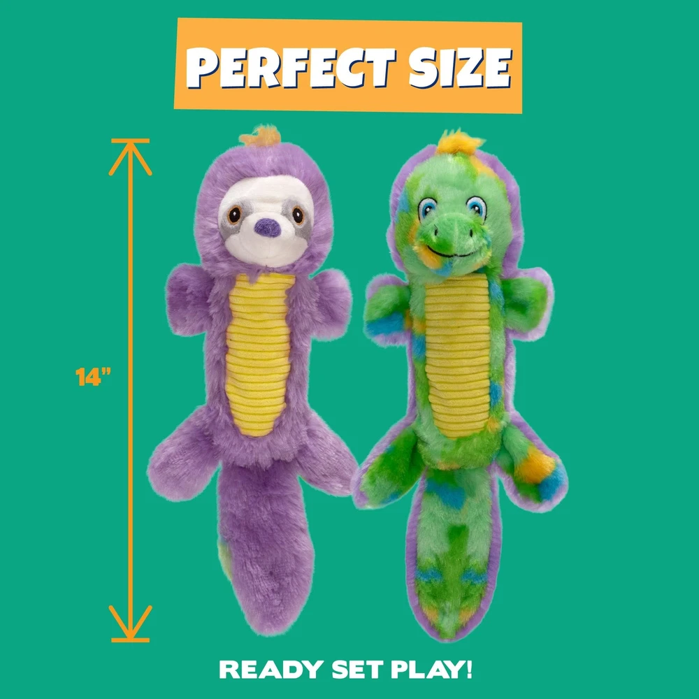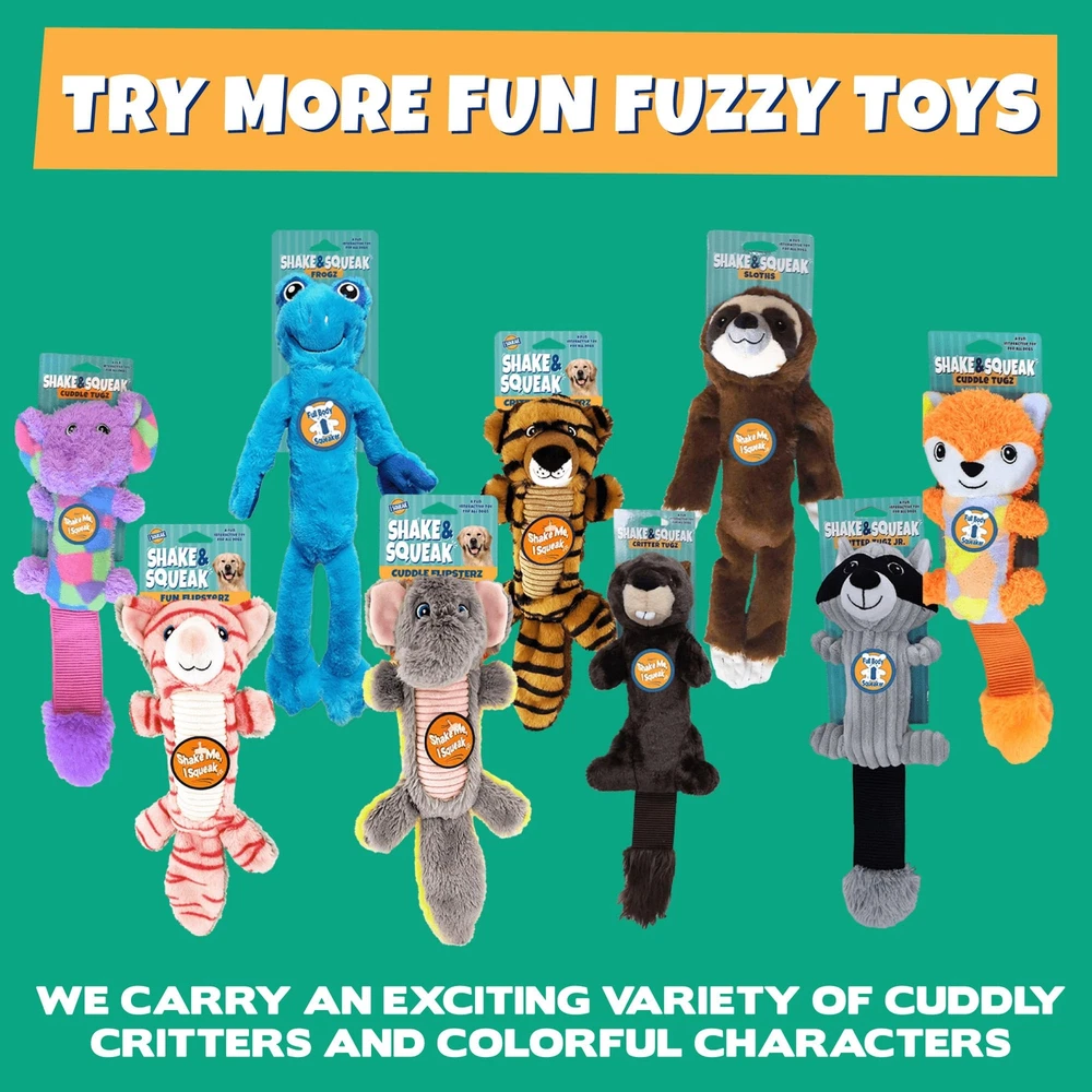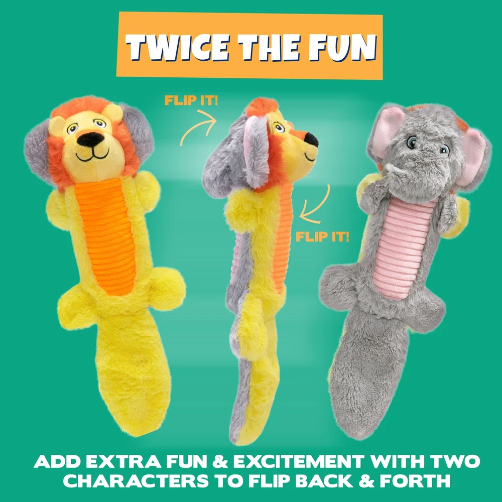 These premium plush toys come in an exciting variety of cuddly critters and colorful characters. Flipsterz are twice the fun with 2 crazy contrasting friends to flip back and forth for extra fun and excitement in your interactive play with your pet. Along with being soft to hug and fun to tug, each toy comes with a full body squeaker that’s perfect for playtimes. Disclaimer: For pets only. Pets should be supervised during use. The toy is not meant to be consumed as ingestion of any non-food item is dangerous to your pet's . If product is excessively worn, damaged, or any part becomes loose or detached, discontinue use and replace as needed. RANDOMLY SELECTED: Only dog toy is supplied, and it is randomly selected from the assortment shown; customers currently do not have the option to choose their desired toy variant FLIPPIN' FUN: Shake & Squeak Flipsterz are double-sided plush toys with contrasting animal characters to flip between for twice the fun and excitement; featuring soft textured plush fabric that dogs and puppies love to play and cuddle with BUILT-IN SQUEAKER: Designed with a full-body built-in squeaker to entice and excite your pup, satisfying their hunting instincts to keep their interest during solo or interactive play INTERACTIVE PLAY: The long plush body of the Flipsterz toys make them great for interactive play between pet and owner; games such as tug or toss are great and super fun ways to bond with your dog FUN & ENRICHMENT: The immediate auditory feedback of squeaker toys excite dogs and encourages play; they are designed to provide enrichment and stimulation, catering to natural and instinctual canine behavior to keep your pup actively entertained PRODUCT DETAILS: Assorted (Dino-Sloth OR Lion-Elephant); 14", Size RECOMMENDATIONS: Pets should be supervised during use; item should be removed if excessively worn, damaged, or any part becomes loose or detached