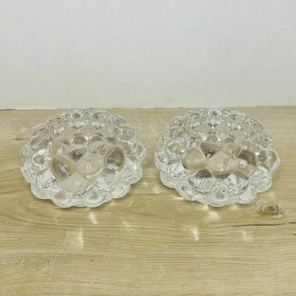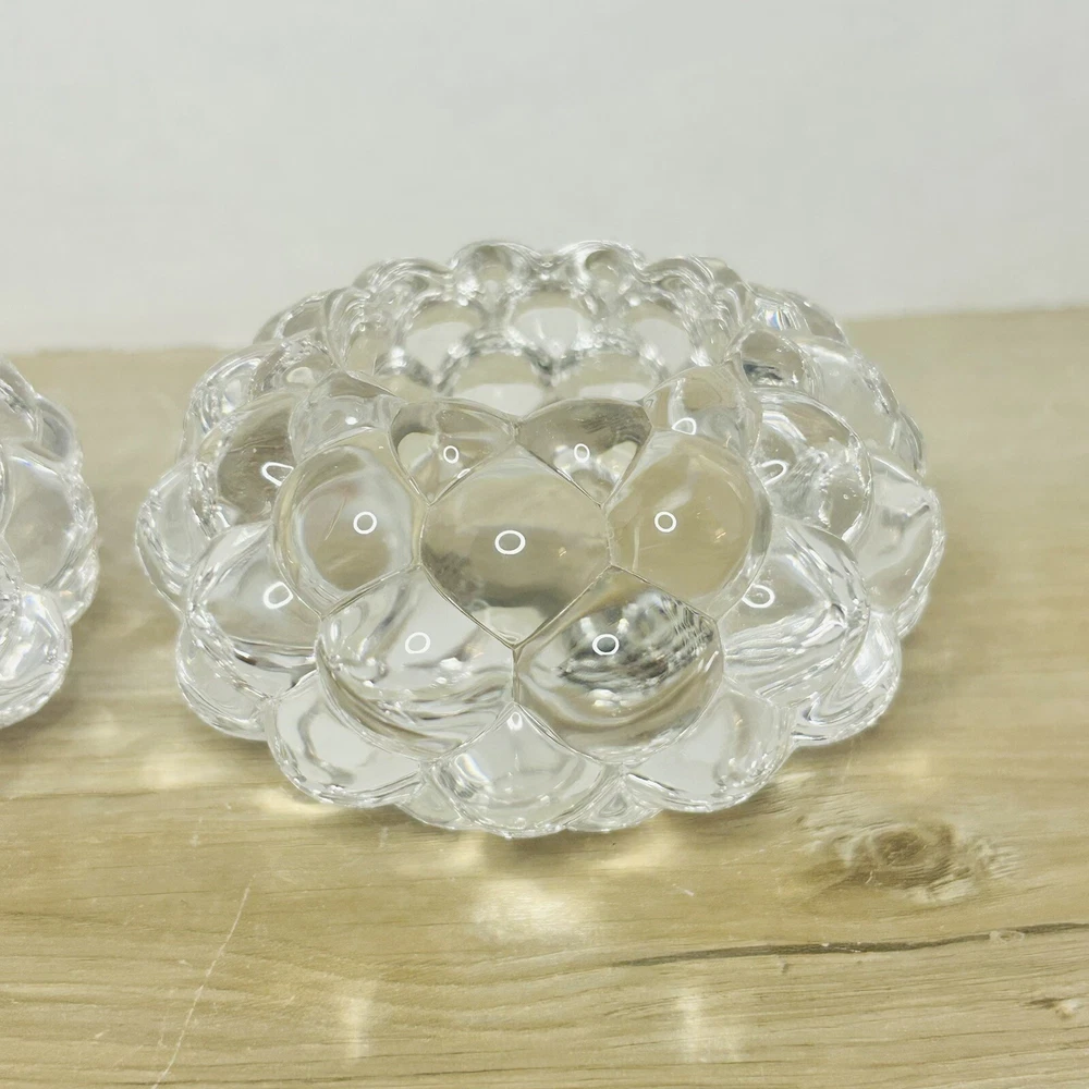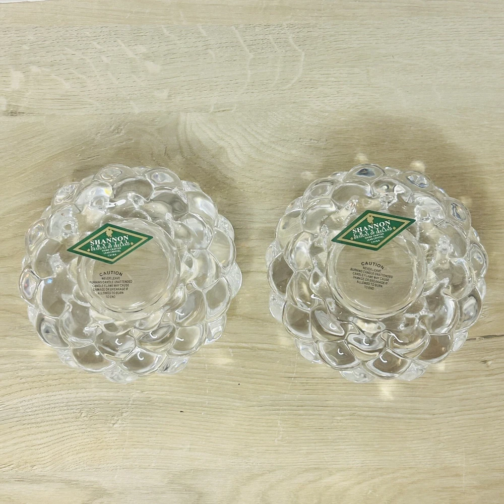 Set of 2 Shannon Crystal Designs of Ireland raspberry bubble style candle holders. Lead crystal. In excellent, like new condition with no chips, cracks or signs of use. Measures 2” tall x 3.5” diameter.