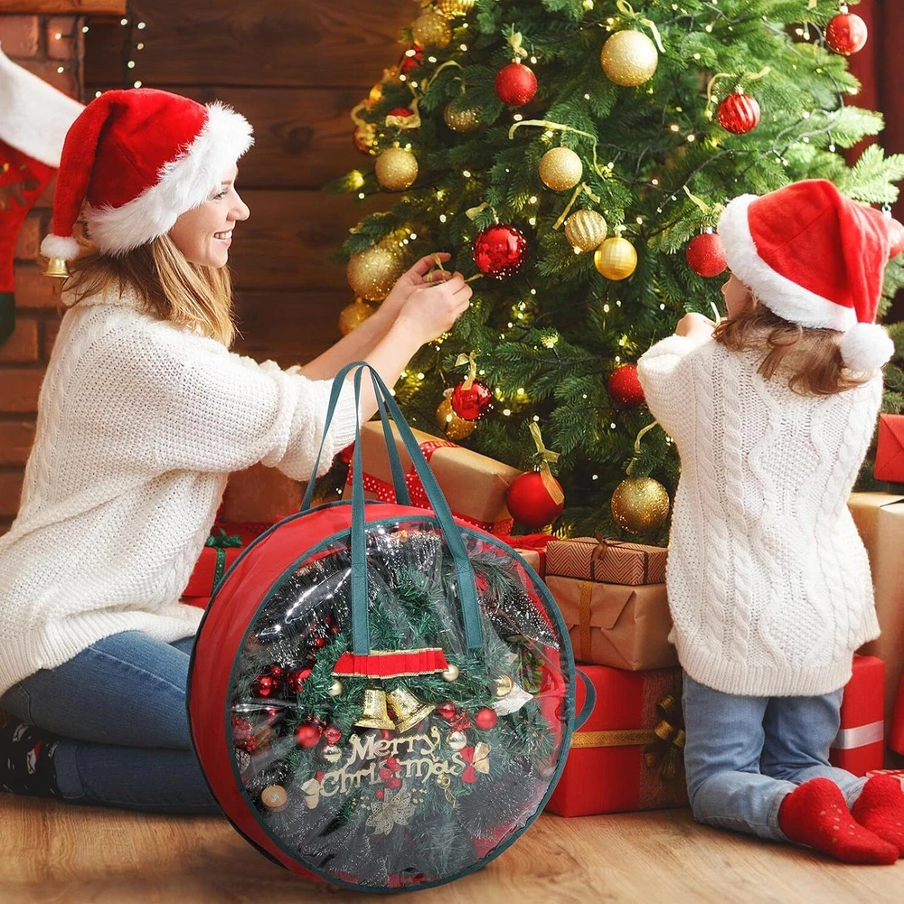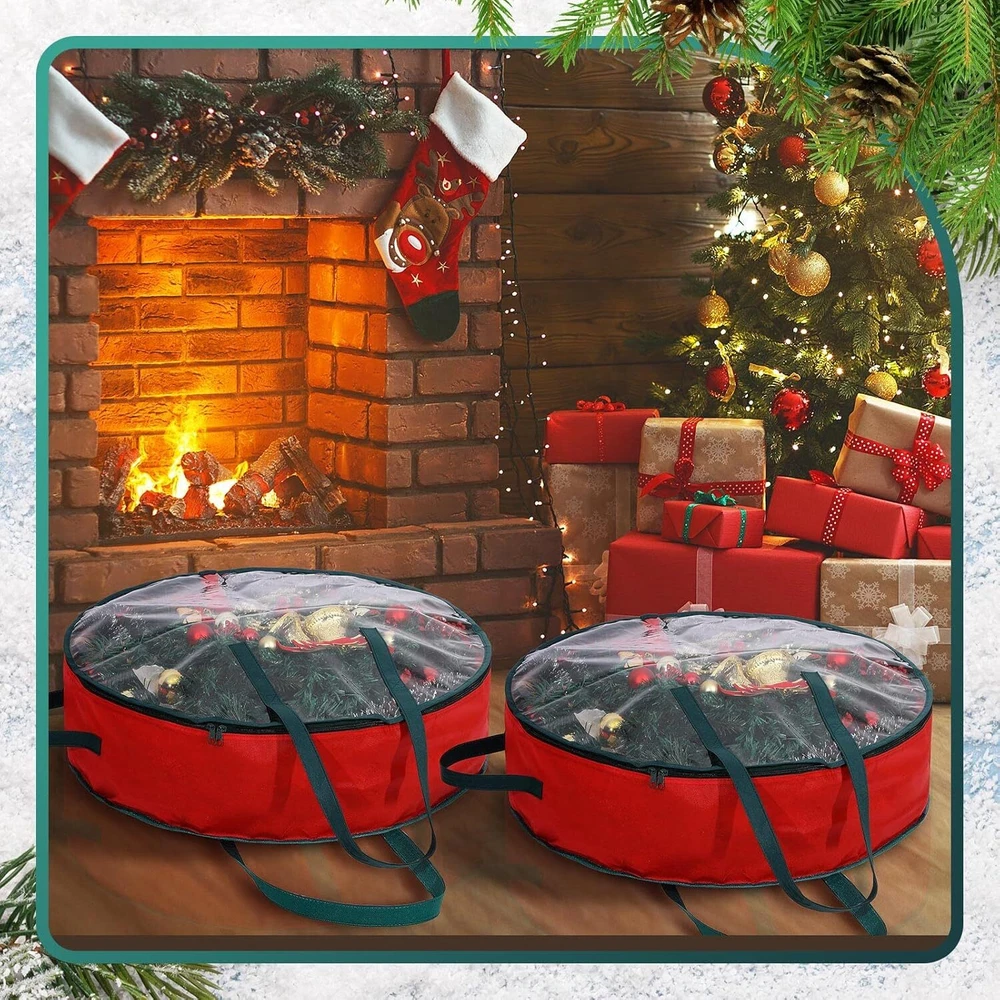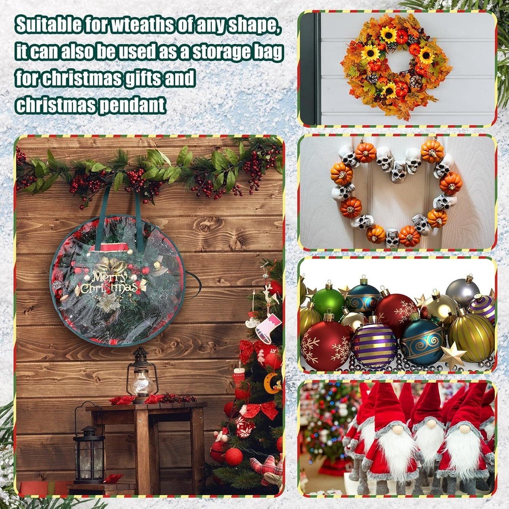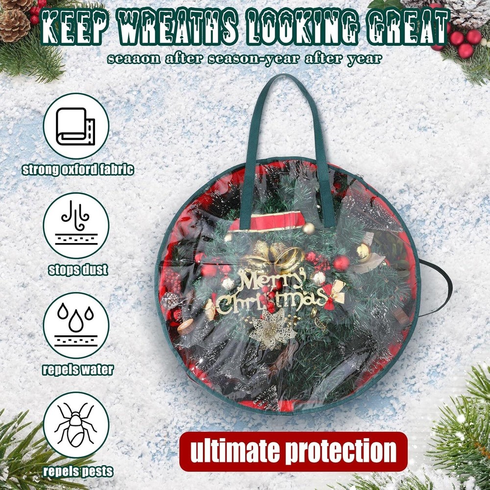 Lightweight But Credible: our Christmas wreath bag is made of quality PVC material and non woven fabric, lightweight but portable with handles for you to hold or hang, not easy to break, deform or fade, clear and reliable, which can offer you a long time service Easy to Use: the wreath storage bag is designed with dual zippers and handles, convenient for you to put the holiday artificial wreaths in or out of the bag, practical and useful; Our Christmas wreath bag comes with 3 carrying handles for easy carrying, so you can hang it on a shelf or wall, or put the bag directly on your cabinet, which can save storage space Multiple Functions: our wreath storage container can be applied not only for Christmas, but also suitable for holiday wreaths use and daily wreath storage, such as Halloween, Thanksgiving or seasonal activities, which can also decorate your house with its clear and round appearance, quite tidy and delicate; Moreover, you can also use it to load some gifts, garlands, and other items Sufficient to Meet Your Needs: you will receive 2 pieces of clear wreath boxes for storage in the package, enough to meet your use and replacement needs for storing most Christmas wreaths Moderate Size: the wreath storage box measures approx. 76 cm/ 30 inches in diameter, and the height is approx. 18 cm/ 7 inches, large enough for you to store wreaths without breaking their shapes, also easy for you to store and carry with sturdy handles