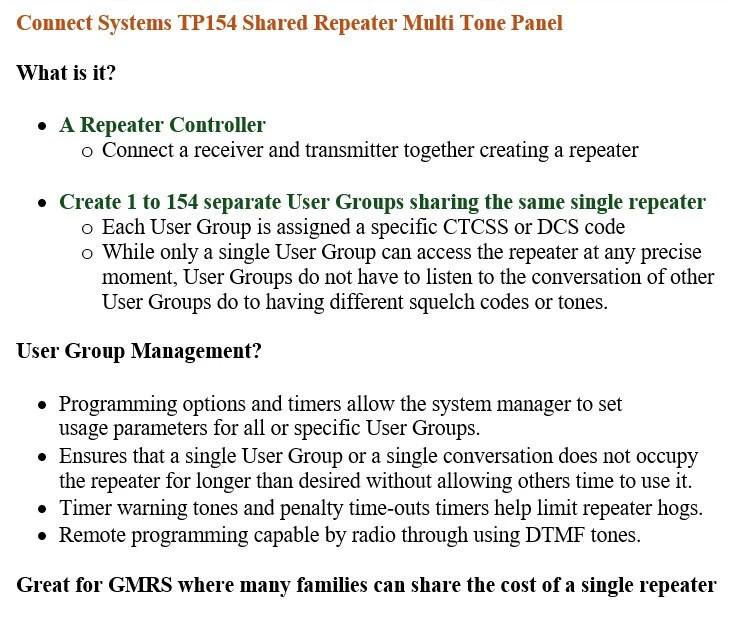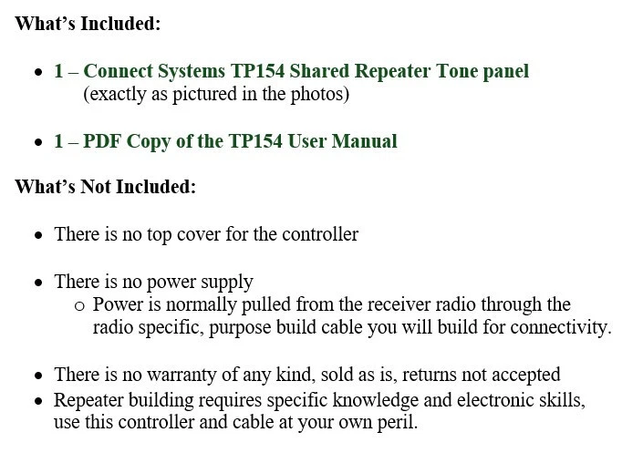 Connect Systems TP154 Shared Repeater Multi Tone Panel What is it? A Repeater Controller o Connect a receiver and transmitter together creating a repeater · Create 1 to 154 separate User Groups sharing the same single repeater o Each User Group is assigned a specific CTCSS or DCS code o While only a single User Group can access the repeater at any precise moment, User Groups do not have to listen to the conversation of other User Groups do to having different squelch codes or tones. How Is It Manages? · Programming options and timers allow the system manager to set usage parameters for all or specific User groups. · Ensures that a single User Group or a single conversation does not occupy the repeater for longer than desired without allowing others time to use it. · Timer warning tones and penalty time-outs timers help limit repeater hogs. · Remote programming capable by radio through using DTMF tones. Great for GMRS where many families can share the cost of a single repeater Communications and Feedback: We will leave POSITIVE FEEDBACK after receiving positive feedback from you. Please contact us through eBay if you have any questions. Good communication can fix most problems. It’s impossible to address issues if we do not know about them! Your contact will be much appreciated!! DO NOT leave negative feedback without first asking for help. Your POSITIVE feedback is HIGHLY appreciated.
