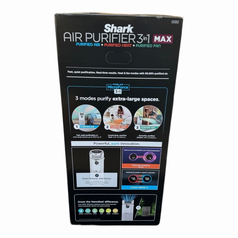 Condition: New. Factory sealed. Original retail packaging intact. Box shows light storage wear. Description: Brand new Shark Air Purifier 3-in-1 MAX, factory sealed. Combines purified air, purified heat, and purified fan in one unit. Covers extra-large spaces up to 1,000 sq ft. True HEPA filtration with NanoSeal technology and Clean Sense IQ. Model: HC502. Ships exactly as shown.