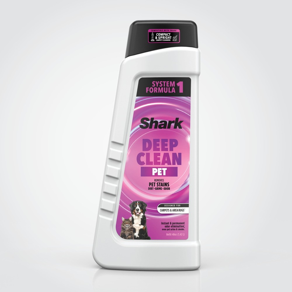 Fight tough stains with the 48oz Shark Deep Clean Pet formula, for use in all Shark upright and compact Deep Carpet Cleaners. Combine with Shark Oxy Multiplier for 20X more stain-striking power* Compatibility: Designed for use with Shark upright and portable deep carpet cleaners Dual-Activated: Pair with Shark OXY Multiplier for 20x more stain-striking power* Tough Stain Elimination: Removes dirt, grime & pet stains Perfect for pets: tackles tough odors, even pet urine and smoke What's Included: 48oz Shark Deep Clean Pet formula *vs Shark Deep Clean Pet Formula
