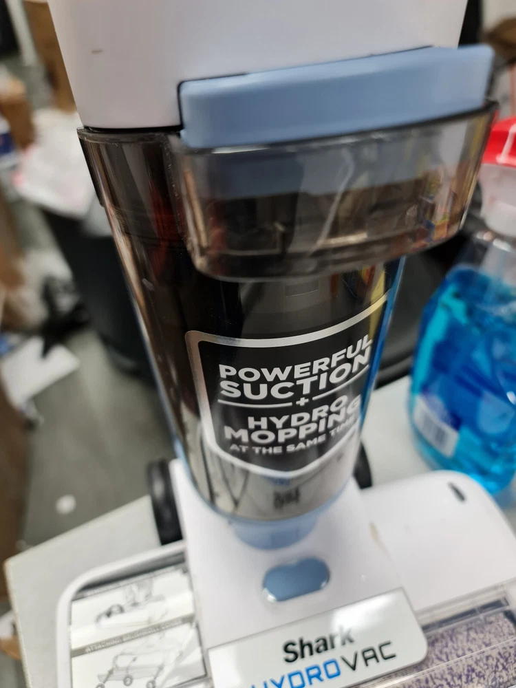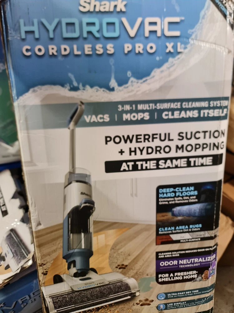 Has some signs of use. Filter is also somewhat used. Includes vacuum with charging base in original box. 3 IN 1 CLEANING : The Shark HydroVac Cordless Pro XL vacuums, mops and cleans itself at the same time to deep clean hard floors and clean area rugs. WET plus DRY MESSES: The powerful suction and hydro mopping pulls in dirt and debris, wet messes, stains and grime to leave a streak free, clean surface that you can walk on almost immediately. STARTS CLEAN, STAYS CLEAN: The continuous self cleaning system helps prevent dirt from being redeposited back on your floor and the antimicrobial brushroll helps prevent odors and bacteria on the brushroll. Brushroll treated with antimicrobial substance to preserve roller and resist bacterial odors on the brushroll. MULTI SURFACE CLEANING: Designed for all sealed hard floors including hardwood, tile, marble, laminate. It also removes surface dirt and odors from area rugs. ELIMINATES ODORS: The Shark HydroVac 12 oz. multi surface concentrate with odor neutralizer technology instantly eliminates and prevents odor from reforming on floors and area rugs. Perfect for pet owners. EASY CLEAN UP: The debris filtration technology in the dirty water tank is designed to separate solids from liquids so you can quickly and easily empty the tank. Place the HydroVac on its dock after every use and activate self clean mode so it is clean and ready for the next use. EXTRA LARGE CLEAN TANK: The intelligently designed system in the XL clean tank combines smart suction and flow control to maximize cleaning efficiency. LED DISPLAY: Seamlessly transition between floor types with the touch of a button on the LED display that also provides real time battery life indicator, surface type and tank levels. CORDLESS CONVENIENCE: Enjoy cordless cleaning power so you can seamlessly transition between rooms without being tied to an outlet. WHAT'S INCLUDED: Shark HydroVac Cordless Pro XL 3 in 1 multi surface cleaner, 1 antimicrobial brushroll, 1 foam filter and 1 charging dock. Brushroll treated with antimicrobial substance to preserve roller and resist bacterial odors on the brushroll.