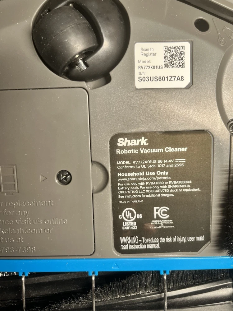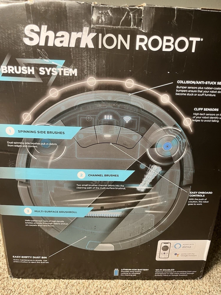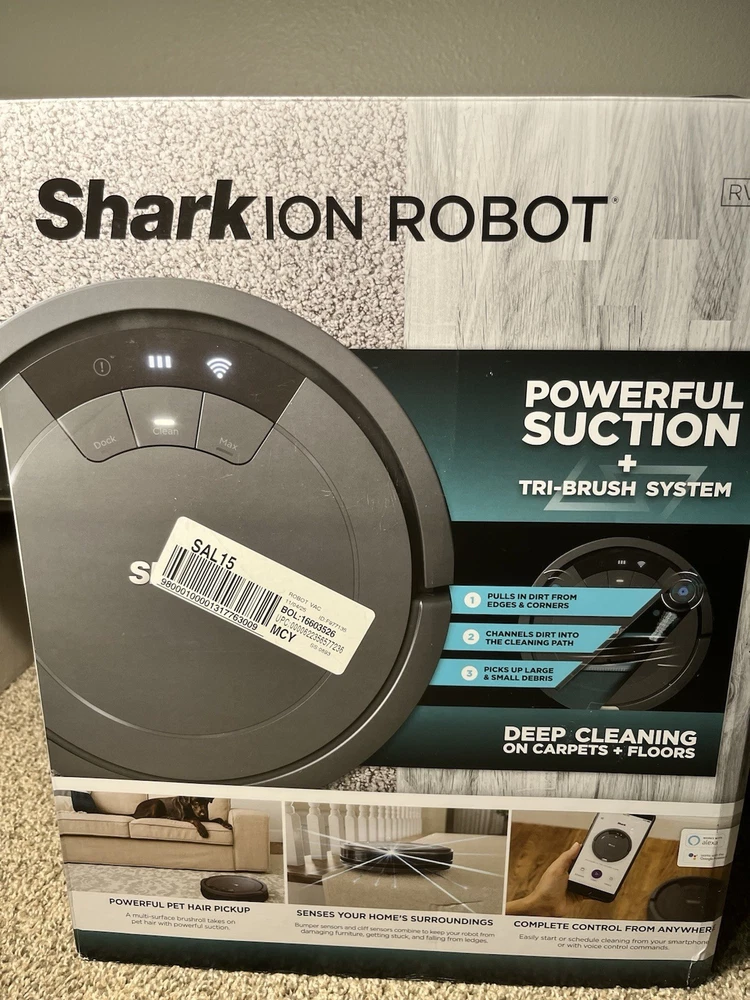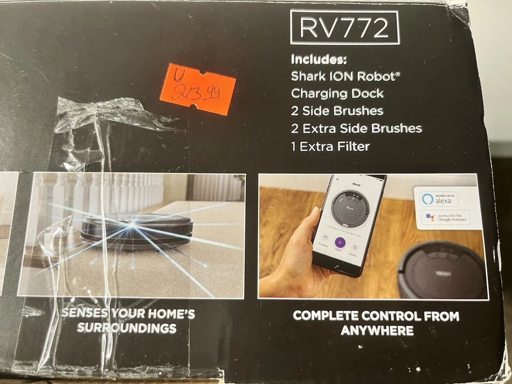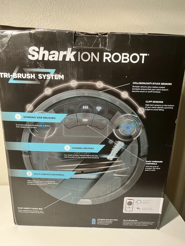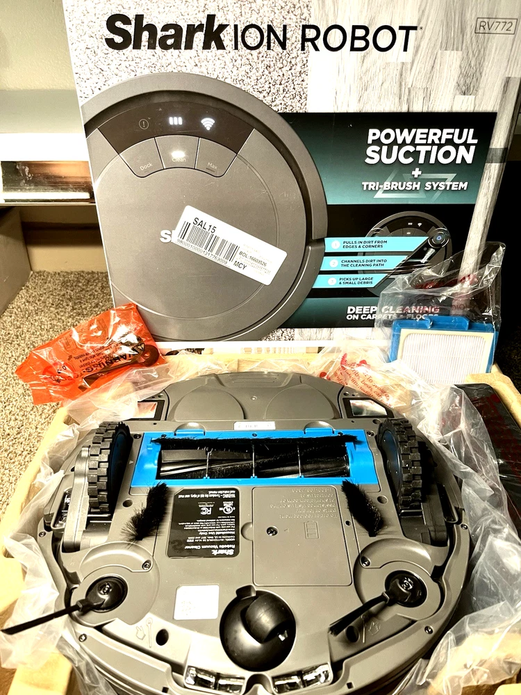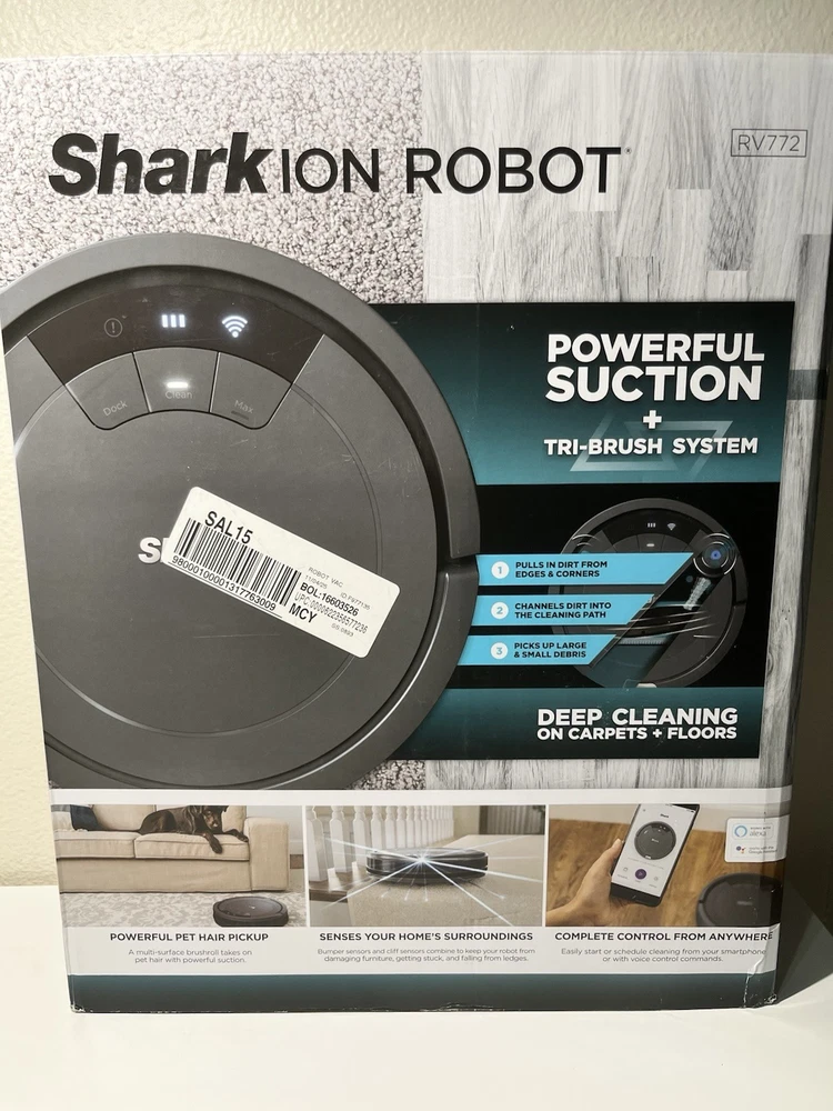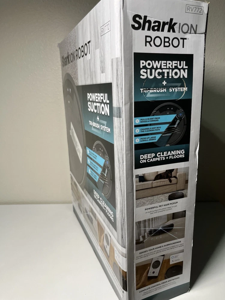 Keep your floors clean with ease using the Shark ION Robot Vacuum RV772 , a smart Wi-Fi–connected robotic vacuum designed for both hard floors and carpets. With strong suction, multi-surface brushes, and intelligent navigation, it delivers efficient everyday cleaning with minimal effort. Set Includes: Shark ION Robot Vacuum RV772 Charging dock 2 Side brushes 2 Extra Side brushes 1 Extra Filter Key Features: Wi-Fi enabled — control from the SharkClean app or via Alexa/Google Assistant Tri-Brush System tackles dirt, dust, pet hair, and debris on all floor types Smart sensors avoid stairs, obstacles, and furniture Up to 120 minutes of runtime for whole-home cleaning Slim, low-profile design fits under beds, sofas, and cabinets Easy-empty dustbin and simple maintenance Condition: Item shows standard shelf-wear from storage; fully functional as intended A reliable everyday cleaning solution — perfect for busy homes, pet owners, and anyone wanting hands-free cleaning.