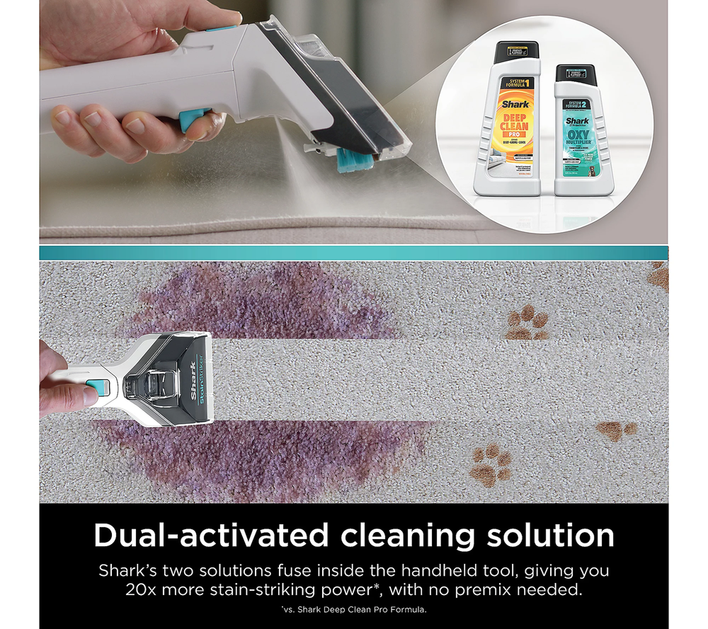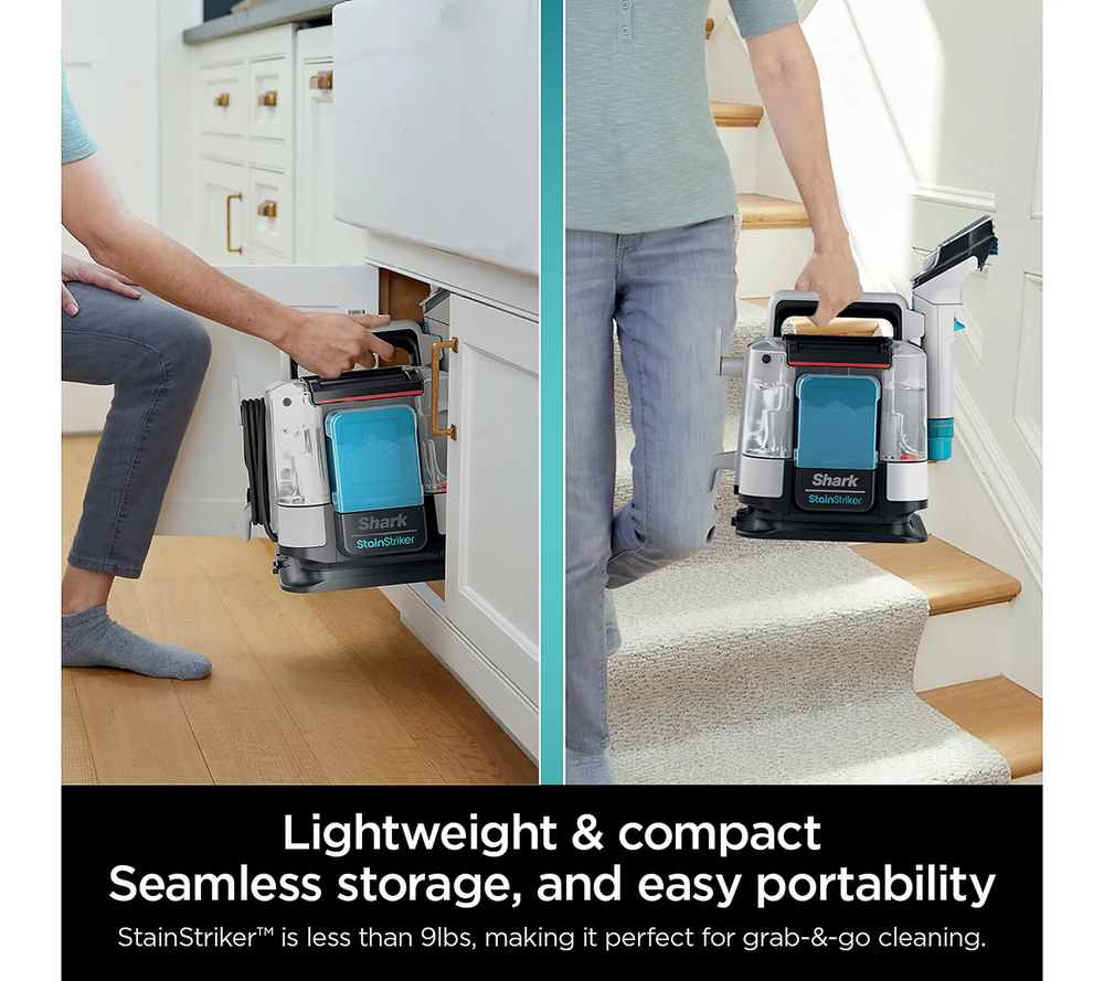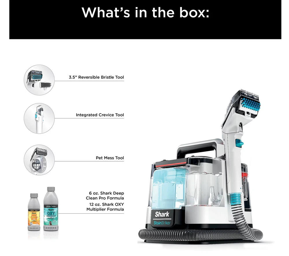 Shark PX201 StainStriker Portable Carpet & Upholstery Cleaner – Powerful Stain Remover Accidents happen, but with the Shark StainStriker Portable Cleaner , you don’t have to live with the mess! This powerful, compact cleaner uses dual stain-busting formulas to tackle tough stains and odors on your carpets, upholstery, and more. Whether it’s pet accidents, food spills, or everyday messes, Shark StainStriker is your go-to tool for a spotless home. What’s Included: Shark StainStriker Portable Cleaner (Model PX201) Integrated crevice tool 3.5" reversible bristle tool for deep cleaning Pet tool for specialized stain removal 6 oz of Deep Clean Pro formula 12 oz of OXY Multiplier formula for enhanced stain and odor removal Key Features: Dual stain removers – mixes and activates powerful formulas to target tough stains and odors Suction power pulls liquid and dirt out of carpets, upholstery, and more Lightweight and portable design makes it easy to use around the house or on-the-go 12-foot cord gives you plenty of reach for large areas Pet-friendly – removes pet stains and odors with ease UL listed for safety Imported Product Dimensions: Approx. 12.83" x 11.57" x 15" Cord Length : 12 feet No more lingering stains or odors—get the Shark StainStriker today and experience hassle-free cleaning with dual stain removers , exceptional suction, and powerful formula for a deep clean every time.