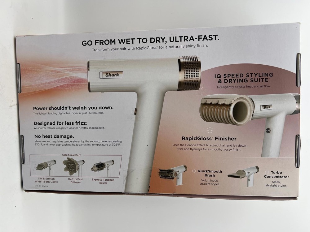 Condition: Open Box, Grade A, Device Functions Properly, All Pieces Included The Shark SpeedStyle HD331 Hair Dryer dries hair quickly without heat damage. It includes three versatile styling tools and suits straight and wavy hair. Using a hair dryer at home should be simple and safe. The Shark SpeedStyle HD331 lets you style like a pro without overheating your hair. It is made for speed and safety. Its advanced digital motor and heating system monitor temperature 1,000 times per second. This keeps air below 110°C (230°F). Your hair stays strong, and you keep its natural shine and smooth look. This hair dryer offers three professional attachments. The RapidGloss Finisher smooths down flyaways for a salon-polished style. It relies on Coanda Technology for excellent shine. The QuickSmooth Brush is perfect for everyday use. It helps with drying, volumizing, and straightening your hair, all at once. The Turbo Concentrator is great for precise styles. Focus on one section at a time for smoother, straighter hair.The Shark SpeedStyle HD331 stands out for its light weight. At just 1.69 lbs, it is easy to hold. Your arms will not get tired, even with longer sessions. Its compact design and balanced weight also make it perfect for travelers. Pack it easily when you are on the go.Smart technology makes it easy for everyone to use. The dryer senses which attachment you put on. It then adjusts heat and airflow. You get four heat settings, so you can pick cool or warm. Choose from three fan speeds too. Lock in styles with a cool shot. Each tool gives a custom result, fast and safely. This dryer’s digital controls are simple to use. Switch attachments quickly with one click. The quiet, powerful motor lets you style your hair early in the morning or late at night. Designed for comfort, you can hold it from several angles. The long cable gives you freedom to move. Its open-box grade A quality means you enjoy like-new performance for a better price.The Shark SpeedStyle HD331 is also durable. Cleaning is easy. Just clear the filter every few weeks. Attachments snap on and off, so switching between them feels effortless. Store the device and its tools in a safe, dry spot to keep them in great shape.Why choose the Shark SpeedStyle HD331? Prevents heat damage for safer, healthier hair Includes three high-quality styling attachments Quick drying to save time in your routine Ergonomic and lightweight for easy handling Ideal for straight and wavy hair