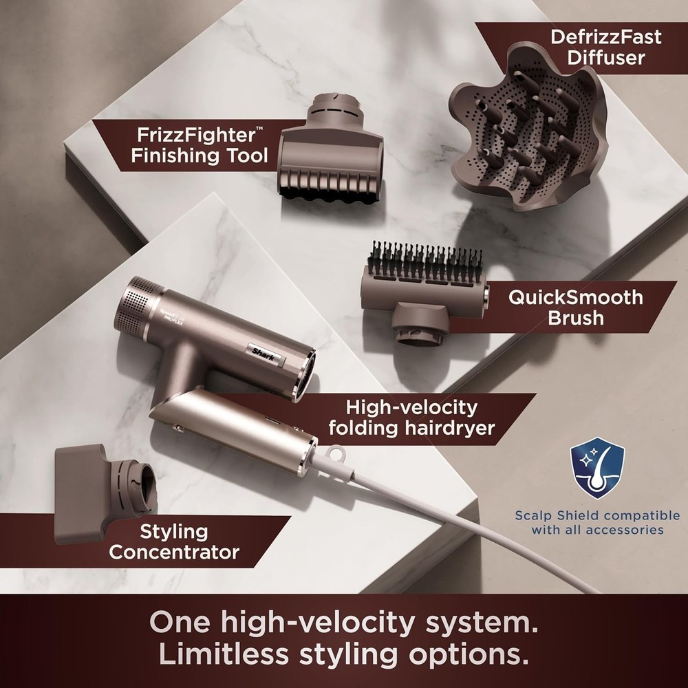 Shark SpeedStyle Pro Flex High-Velocity Hair Dryer System Ionic No Heat Damage About this item PROFESSIONAL PERFORMANCE: Style with high-velocity airflow for wet-to-dry, ultra-fast styling with no heat damage, in a compact design. Achieve flawless salon-quality blowouts, defined curls, and a high-gloss shine at home. HIGH-VELOCITY. COMPACT DESIGN: Airflow reaches 0-100 mph in less than a second. Style with higher airflow velocity in a more compact design vs the leading luxury hair dryer* *Third party tested vs. leading hair dryer over $200. SCALP SHIELD MODE: Activate to instantly reduce air temperatures to the optimum safe level for scalp comfort and root drying. Designed to protect new hair growth from extreme heat. Developed with dermatologists. Approved by stylists. FOLDING HANDLE: Folds to half its size for compact storage in bags, purses or carry-ons. Features an ultra-lightweight and compact travel-friendly design for easy carrying, while still delivering powerful drying. NO HEAT DAMAGE: SpeedStyle Pro FLEX measures and regulates temperature 1,000 times a second, never exceeding 230°F, and never approaching heat damaging temperature of 302°F. TURBO CONCENTRATOR: Designed to give you sleek, straight styles with no heat damage. It features a 360° rotatable nozzle - adjust it to your desired angle for easy, controlled styling. Perfect for every hair type. Product Description Meet Shark SpeedStyle Pro FLEX High-Velocity Hair Dryer System. Designed with professional performance in a compact, flex design without compromising power. Get salon-quality blowouts, defined curls, & high-gloss shine at home with high-velocity airflow reaching 100 mph in under a second, with no heat damage. Includes Scalp Shield — designed to protect new hair growth from extreme heat.