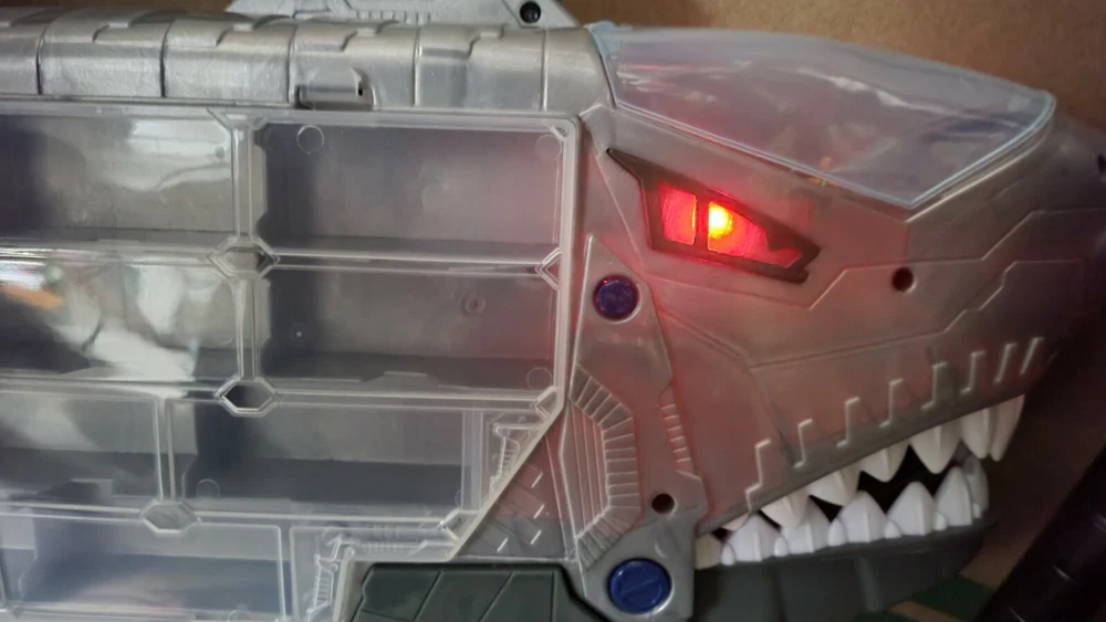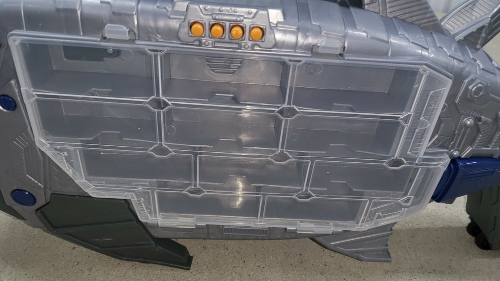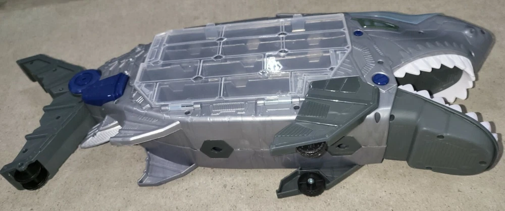 Toy Car Double Sided Storage Organizer Carrying Case Shark Lights & Sounds WORKS. It is approximately 27 inches long by 4.5 inches wide by 11.5 inches tall. The lights and sounds work perfectly and it rolls smoothly. It has a bullet/missile Launchers on top, but no missles are includes. Holds 22 cars. We ship the same business day in most cases.