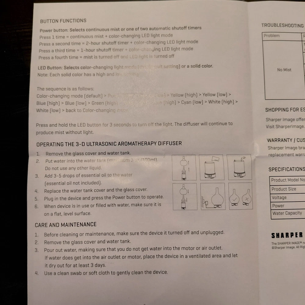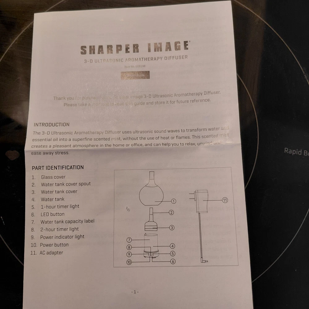 Sharper Image 3D Ultrasonic Aromatherapy Diffuser – LED Lighted Create a calming space with this Sharper Image ultrasonic diffuser featuring a stunning 3D color-changing LED effect. Ideal for bedrooms, offices, or meditation areas. Details: • Brand: Sharper Image • Type: Ultrasonic Essential Oil Diffuser • Lighting: 3D color-changing LED • Timer Settings: 1 hour / 2 hours • Tank Capacity: Approx. 100–120 mL • Material: Glass top with wood-look base • Dimensions: 5.25" base diameter x 9.5" height • Power: Plug-in adapter included • Function: Cool mist diffuser & mini humidifier Includes: • Diffuser unit • Power adapter • Instructions • Original box Disclaimer: ⭐ Ships same or next business day after payment. ⭐ Please review photos and description for included items and any flaws. ⭐ Stored in a pet-free, smoke-free home. ⭐ International orders ship through eBay’s international shipping program. 🌟 "Have a beautiful 11/11 day!!" 🌟