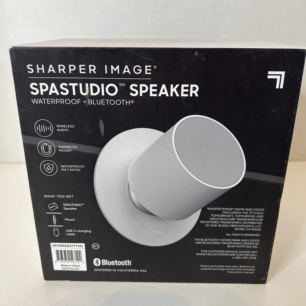 The Sharper Image Spastudio Shower Speaker is a wireless Bluetooth speaker designed for use in the shower. It features a waterproof design and a convenient magnetic mount for easy installation in the shower area. The speaker has a rechargeable battery with a USB-C port for charging and offers a crisp and clear audio experience. With its sleek white color and modern design, the Spastudio Speaker is a versatile and practical audio accessory for those who enjoy listening to music or podcasts while showering.