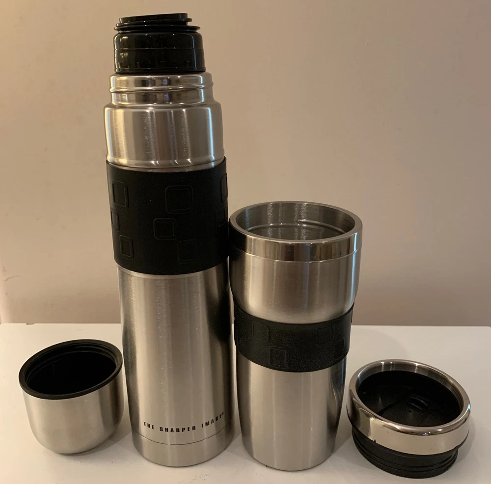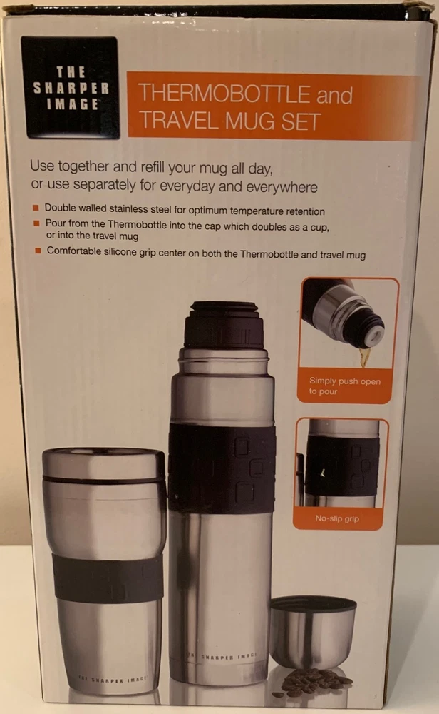 This set includes a Sharper Image thermobottle and travel mug in silver stainless steel. Suitable for both hot and cold beverages, it is ideal for on-the-go use and maintaining drink temperatures.