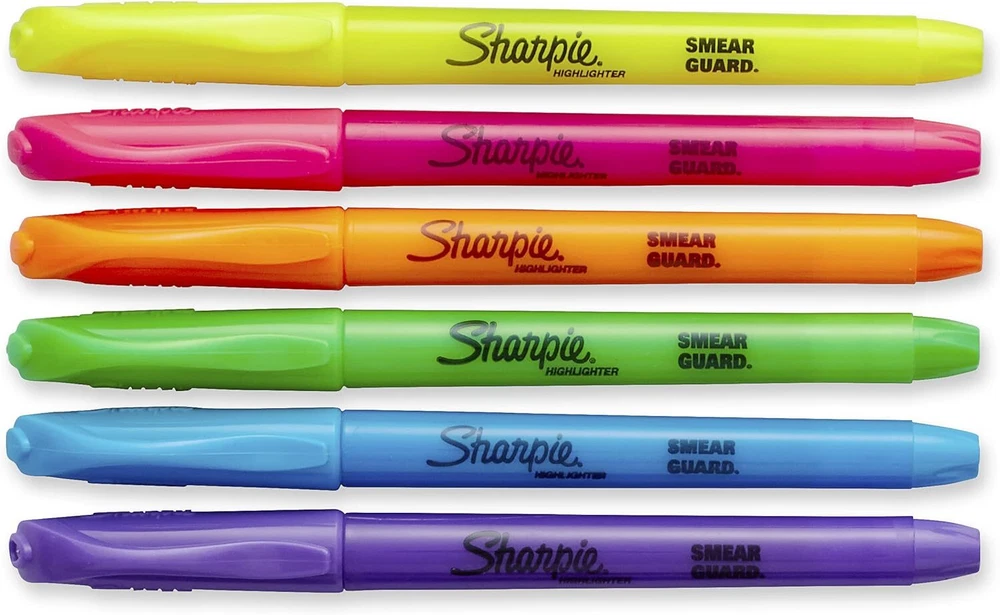 Sharpie Pocket Highlighters, Chisel Tip 24 Count (Pack of 1), Assorted Product Details Manufacturer: Sharpie Brand: SHARPIE Item Weight: 1.6 ounces Product Dimensions: 6.3 x 6.2 x 1.3 inches Item model number: 1761791 Is Discontinued By Manufacturer: No Color: Assorted Material Type: Plastic (body), Porous Material (tip) Number of Items: 1 Size: 24 Count (Pack of 1) Point Type: Chisel Line Size: 4 Ink Color: Blue,Pink Manufacturer Part Number: 1761791 Brand: SHARPIE Ink Color: Blue,Pink Number of Items: 1 Point Type: Chisel Recommended Uses For Product: Light Super-slim Sharpie Pocket Highlighters fit easily into pockets, backpacks, or clip to your shirt Bright ink stands out on the page Versatile chisel tip great for highlighting, underlining, and writing notes Resists smearing (let ink dry before highlighting) Includes 24 highlighters in assorted colors Perfect for when info is high priority and precision is a must, Sharpie Highlighters make everything highly visible with brilliant colors in transparent, smooth, and quick-drying ink. These versatile pocket highlighters are designed to fit effortlessly in your pocket or clip to your shirt for easy, on-the-go highlighting. The quick-drying ink resists smearing many pen or marker inks, while the versatile chisel tip highlights and underlines both wide and narrow lines of text. And with an array of brilliant colors, Sharpie highlighters make your most important thoughts and notes jump off the page. It’s no wonder why Sharpie is the got-to-have highlighter for life’s major high points.