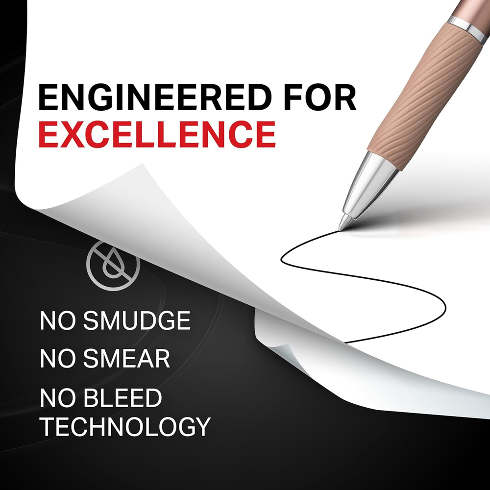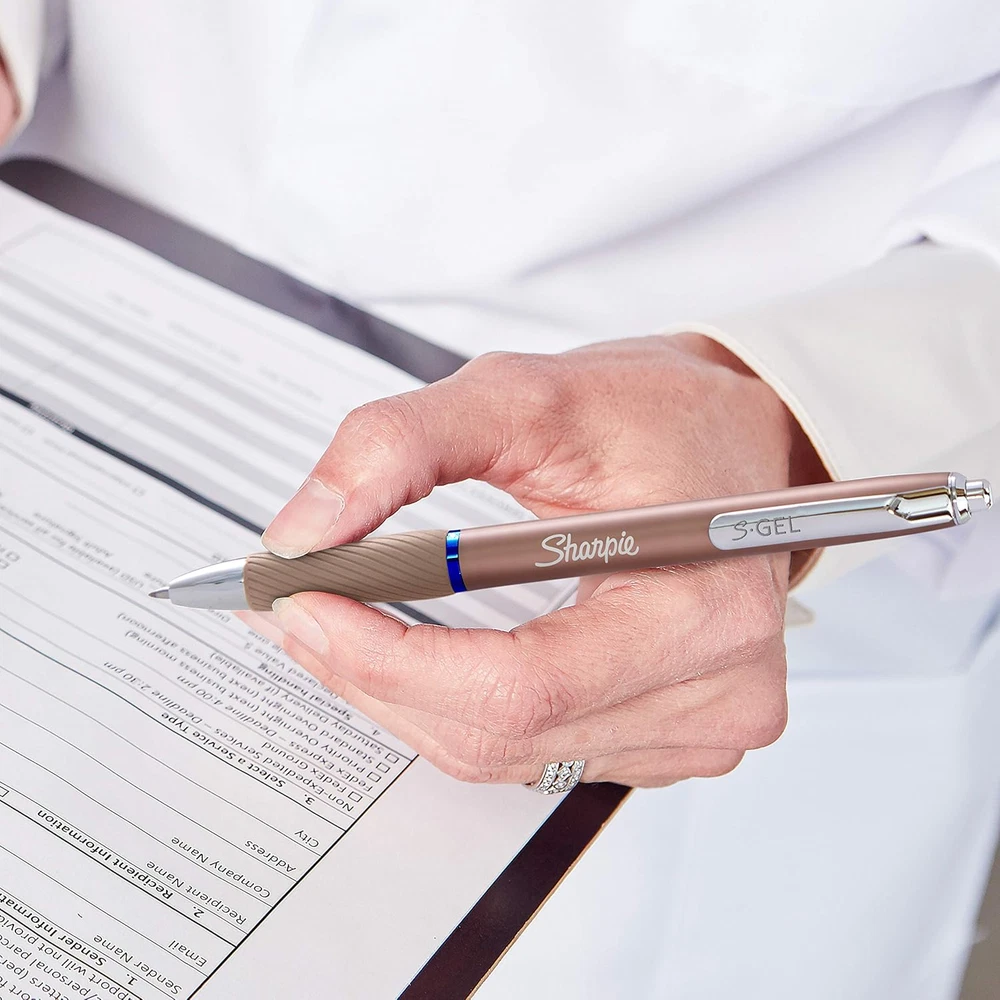 Sleek metal barrel for an eye-catching, premium look Gel pen with no smear, no bleed technology Intensely bold gel ink colors offer always-vivid writing Contoured rubber grip for a comfortable writing experience Includes 4 black gel ink pens in medium point (0.7mm) The power of Sharpie is now in a metal gel pen. This Sharpie S-Gel is a high performance gel pen with a sleek metal barrel and professional look that's sure to stand out. With no smear, no bleed technology and bold, unrivaled ink, this Sharpie pen delivers always-vivid writing. And the contoured rubber grip makes for a comfortable writing experience during any writing task—perfect for homes, schools, or offices.