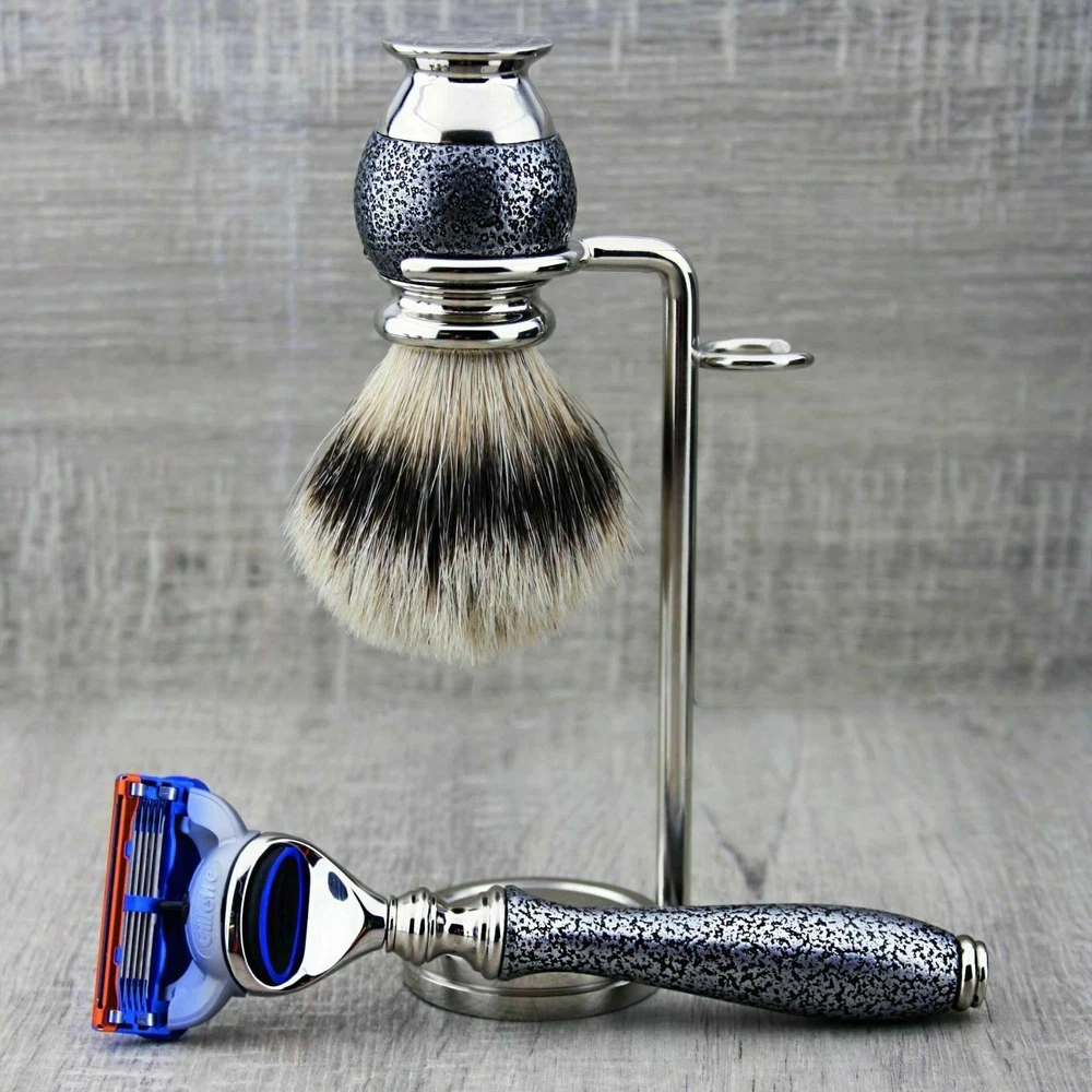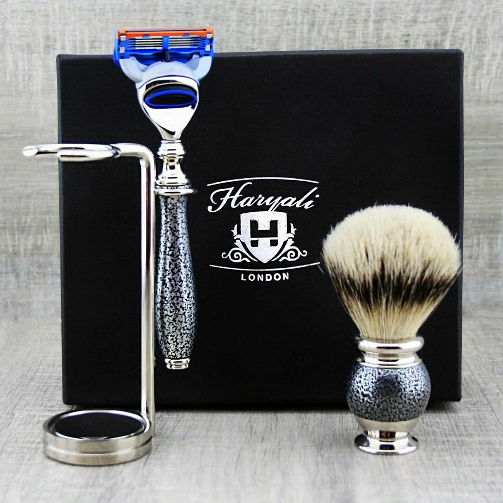 Men's Grooming Clean Shave Set Silver 5 Edge Razors Brush Stand Christmas Gifts This product data sheet is originally written in English. 3 PIECE SILVER ANTIQUE LOOK SHAVING SET by Haryali London SILVER TIP BADGER HAIR No hair equals silver tip in the market - the smoothest, most durable and high quality bristles. The best quality is ensured by a careful selection of the hair which gives the brush its special identity features - the shimmering silver colour and a black band running though the hair, making them easy to identify. Being the finest natural hair for handcrafted shaving brushes these make for durable, high-quality unique pieces that promise to elevate your wet shaving to another level. 5 EDGE SHAVING RAZOR If it's a close yet very comfortable shave you're looking for look no further. This razor uses readily available 5 Blades that are tug free and smooth on the face. Our 5 Edge Razor has been designed to provide optimal balance whilst sitting comfortably in your hand. This is an exceptional wet shave razor in looks and performance. BRUSH & RAZOR STAND A chrome plated finish stand designed to hold both your brush and razor. Not only does this stand provide you with a stylish way to keep your shaving products but it also fits a practical need and care - it provides you with the best way to keep your brush, making it easier to dry and extending its life span and keeping it in the best condition. This standard stand is also suitable for many of other brushes and razors. FREE ALUM PENCIL THE SET COMES IN A DESIGNER BOX BY Haryali London Why should you buy our products? Because we offer... Same Day Dispatched (if orders placed prior to 2:00 pm ) Answer customer Queries 24/7 Lifetime Guarantee against manufacturing defects Excellent Quality, 100% Satisfaction Guarantee Images are of actual items so you can be confident that what you see is what you get . If for any reason item does not meet your expectations, we will refund 100% of your payment Warranties Haryali London instruments have a life time warranty against defects in materials and workmanship, Any product which proves to be defective will be repaired or replaced free of charge. We guarantees against breakage, joint failure, and corrosion under normal use. Warranty does not apply to normal wear and tear and use of the instrumentation beyond their limitations. It also excludes the improper usage of an instrument in a way that the particular instrument was designed and intended to be used. Moreover, instruments damaged in an abusive or accidental manner are also excluded by this warranty. Payments & Shipments PayPal – Only form of Payment that we Accept. Normal Delivery time is 1 - 2 working days for delivery within United Kingdom with Royal Mail First Class Post. Return Policy If customers are not fully satisfied with our product, simply return the item to us in an unused condition and we will process a refund once the item is received. Contact US If you have any questions, then kindly please contact us via the ‘Ask a question’ Tab which is located on the bottom of the listing page. Customers Note Our customer satisfaction is at the top of our priority. We aim to provide a pleasant shopping experience for all of our customers. If there are any questions or problems, then kindly please contact us via an ‘eBay’ message and we take every effort to answer all of the queries put forward for us within 24 hours. If for some reason you are not fully satisfied with your purchase, then please do not leave negative feedback before contacting us as we will resolve the issue for you. If you are interested in more products then kindly please have a look at our eBay shop. Thank You for shopping with us and we hope to see you soon! No hair equals silver tip in the market - the smoothest, most durable and high quality bristles. The best quality is ensured by a careful selection of the hair which gives the brush its special identity features - the shimmering silver colour and a black band running though the hair, making them easy to identify. Being the finest natural hair for handcrafted shaving brushes these make for durable, high-quality unique pieces that promise to elevate your wet shaving to another level. Our customer satisfaction is at the top of our priority. We aim to provide a pleasant shopping experience for all of our customers. If there are any questions or problems, then kindly please contact us via an ‘eBay’ message and we take every effort to answer all of the queries put forward for us within 24 hours Brush Size 20 mm Bowl Material Not included MPN Does not apply Colour Silver Set Includes Stand Set Includes Alum Stick Set Includes Brush Set Includes Razor Bowl Diameter Not included Handle Material Aluminium Brand Haryali London Model Non Type Shaving Kit Brush Material Badger Hair