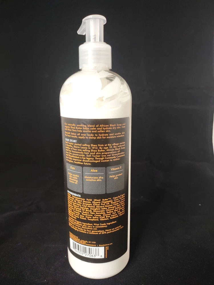 Ingredients:Water, Butyrospermum Parkii (Shea) Buttergtin13:764302270638Main Purpose:MoisturizerFormulation:LotionItem dimensions L x W x H:2.5 x 2.5 x 8.85 inchesUPC:764302270638Brand:SheaMoistureProduct Benefit:moisturizing,hydrating,nourishing,replenishingExpiration Date:Guaranteed FreshAge Range (Description):AdultSize:16 Fl Oz (Pack of 1)Color:BlackFeatures:Not Tested on AnimalsDepartment:UnisexType:Skin Soothing LotionVolume:16 Fluid OuncesScent:african black soapSkin Type:Oily, Dry, Sensitive