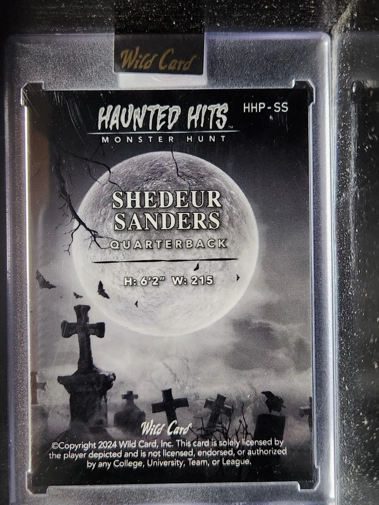 Sport: Football Season: 2024 League: National Collegiate Athletic Association (NCAA) Set: 2024 Wild Card Haunted Hits Type: Sports Trading Card Manufacturer: Wild Card Team: Colorado Buffaloes Player/Athlete: Shedeur Sanders Features: Parallel/Variety, Rookie, Serial Numbered, ssp