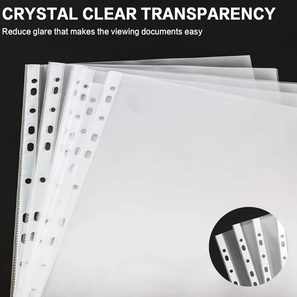 SheetProtectors-500Pack Five hundred PACK SHEET PROTECTORS: polypropylene sheet protectors are suit for standard letter sized paper, our top loading 9.25" x 11.25" sheet protectors with 11 holes fit 8.5 x 11 paper and will keep your standard letter sized papers safe in most binders or folders. Our safe swing ring sheet protectors for 3 ring binders can hold up to 10-20 sheets depending on thickness PREMIUM QUALITY: Our sheet protectors excluding PVC, odor and acids and made of environmentally safe recyclable polypropylene, ideal for long-term storage. Hole line is reinforced with a white polypropylene reinforcement strip for extra strength and practicality HIGH DEFINITION: With clear page protectors, it's easy to clearly view the contents of archived documents, copy paper, photo paper, records, recipes, references, business documents, and photographs, while a slight texture reduces glare and protects your eyes TOP LOADING DESIGN: The wide top-loaded binder sleeves opening makes inserting easy, and the various pre-punched holes allow our clear binder sleeves to be used with file, photo, or recipe binders STURDY AND PRACTICAL: Our ultra lightweight sheet protectors that are enough thick to ensure your papers and documents stay safe for years to come. These protectors absorbs wear & tear, provides great performance,25、practicality and frequent daily use at home, school or office for any documents you want to keep safe or that are frequently used, Archive safe with our design excluding PVC and Acid