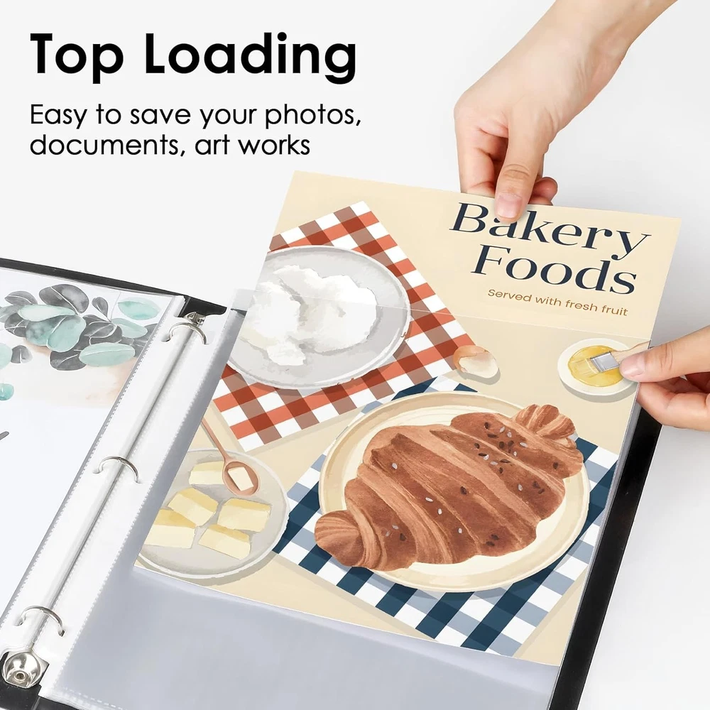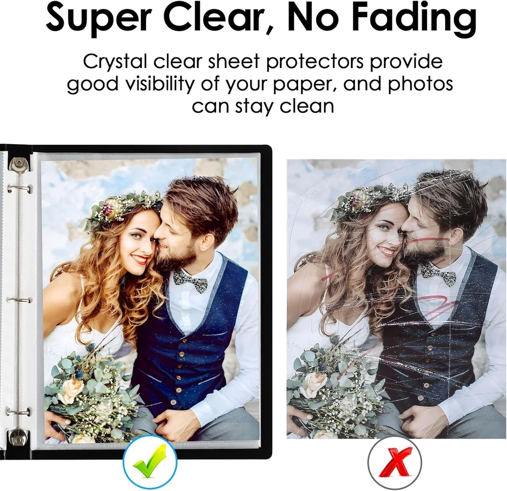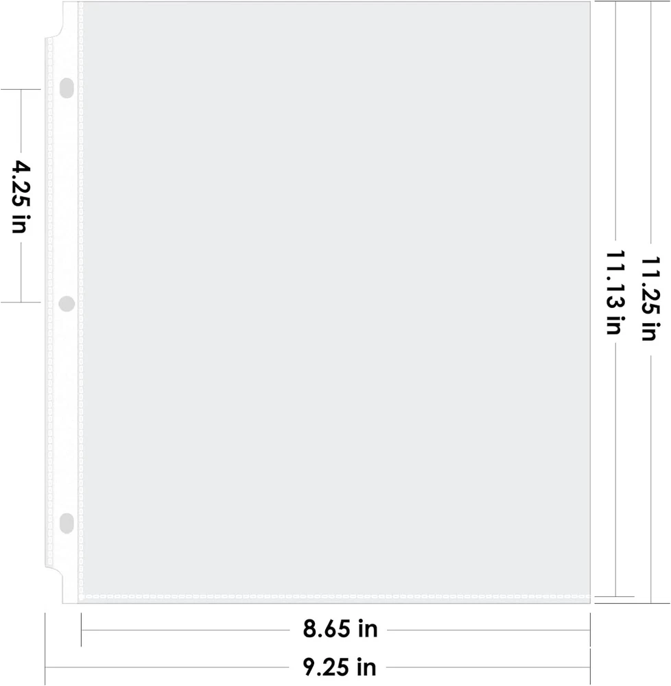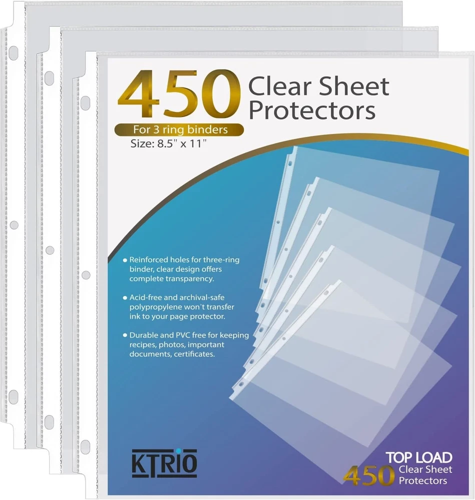 Sheet Protectors x 11 inch Clear Page Protectors for 3 Ring Binder, Plastic Sleeves for Binders, Top Loading Paper Protector Letter Size, 450 Pack Document Protection: Each x inch paper protector can hold x 11 inch letter size paper, 450 pack. 2 sheets of paper can be placed in one pocket. Easy Access Top Loading: Page protectors are for easy top loading, the sleeves are nonstick. Your document is easy to put in the take out, and it is writable for daily use, great for your office and school supplies. Crystal Clear Visibility: The 3 hole sheet protectors are super clear for you to read the document words and images. And Also provide good visibility. The document and photo will not fade, you can store them for a long time. Durable and Sturdy: Made of premium quality polypropylene, PVC free, reinforced edges, fit for standard 3 ring binder. No tear or damage over time. We provide good customer service, any quality issues, please feel free to contact me. Versatile and Practical: The paper protector is ideal for keeping and organizing recipes, photos, important documents, certificates, and music sheets.