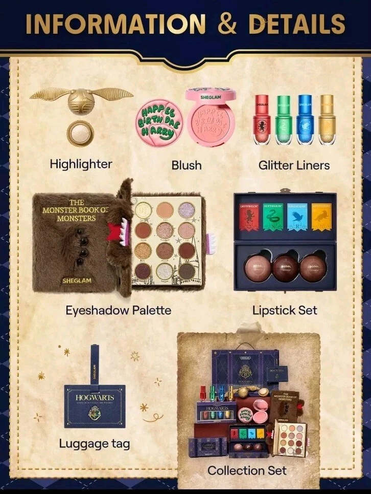 Sheglam HARRY POTTER NEW Collection Makeup Set 100% Authentic Brand New. After the Accio-mazing success of our first collection, we couldn't wait to conjure up something new! Our second SHEGLAM Collection is FINALLY here to work its magic on your beauty routine. Get ready to dive into a cauldron of enchantment with eyeshadows as exciting as the Monster Book of Monsters, glitter liners that outshine the Goblet of Fire, and a blush inspired by Harry's famous birthday cake (because who doesn't love a sweet glow-up?). this collection has everything you need to elevate your look with a touch of spellbinding fabulousness. Benefits: Cruelty-Free, Long-Wearing, Moisturizing, Recycling