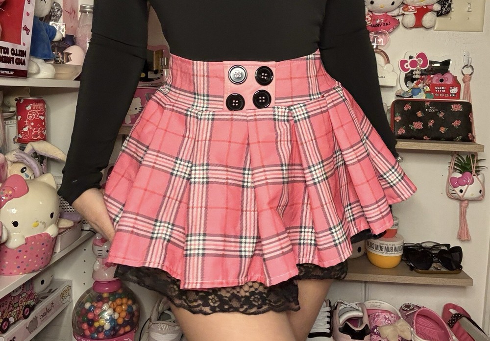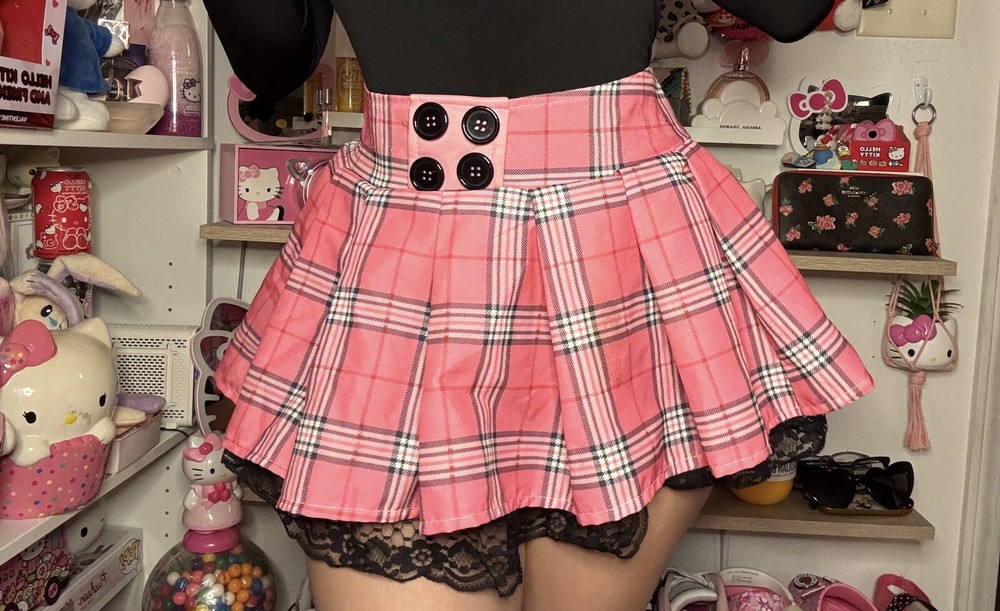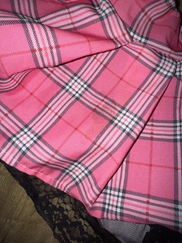 Shein Pink plaid pleated skirt with lace trim #kawaii #skater size XS/Small, super short, super cute!! Has a glitter stain as pictured but it’s not too noticeable when worn. Also some very small marks inside as pictured, lacy black lining! Hi guys! Please check out my page, I’m posting MANY more sets & Bundles All week! I’m moving into a smaller apartment & getting rid of my clothes!! Open to offers & bundling! I ship same day before 6pm, central time zone. All of my items come from a pet friendly & smoke free home btw!