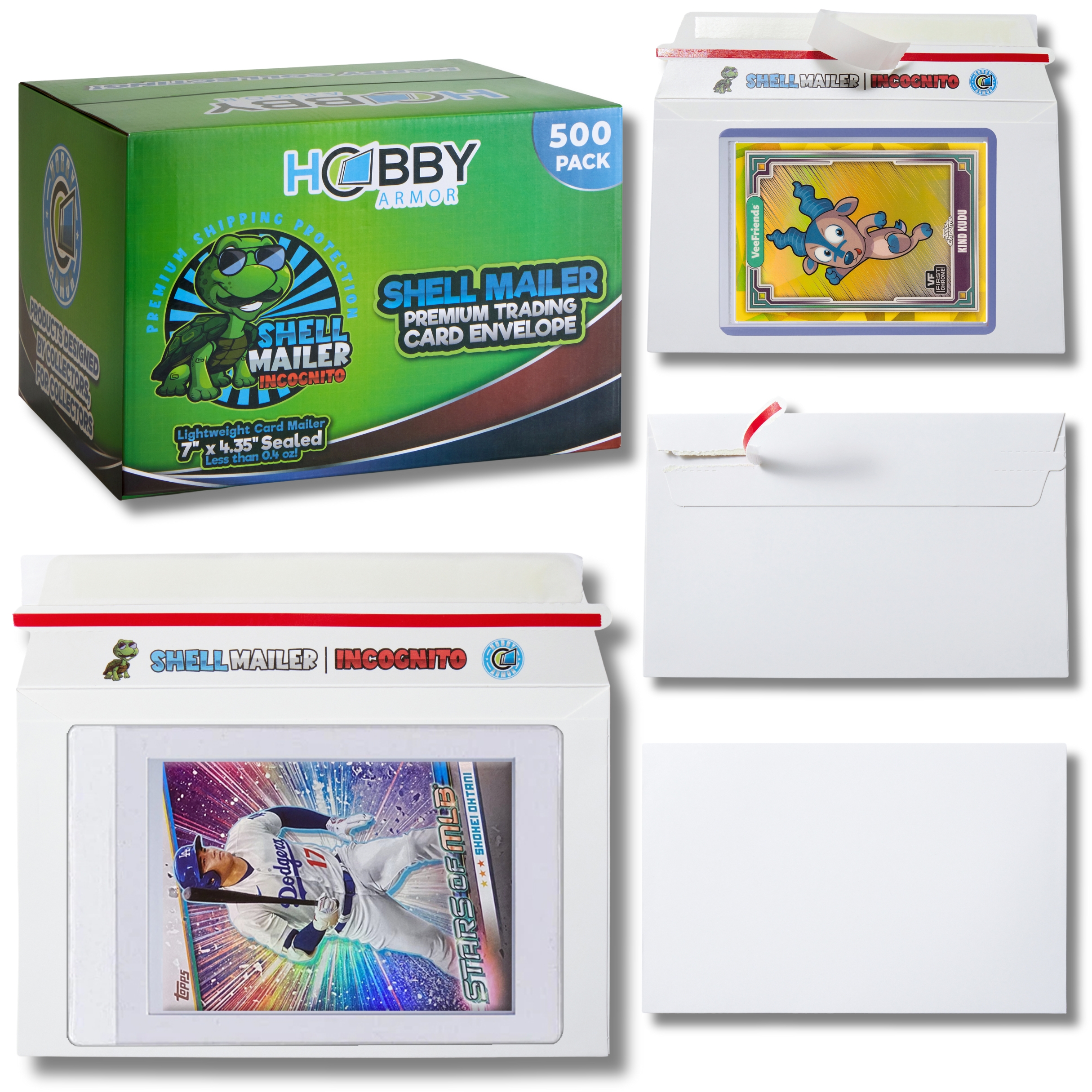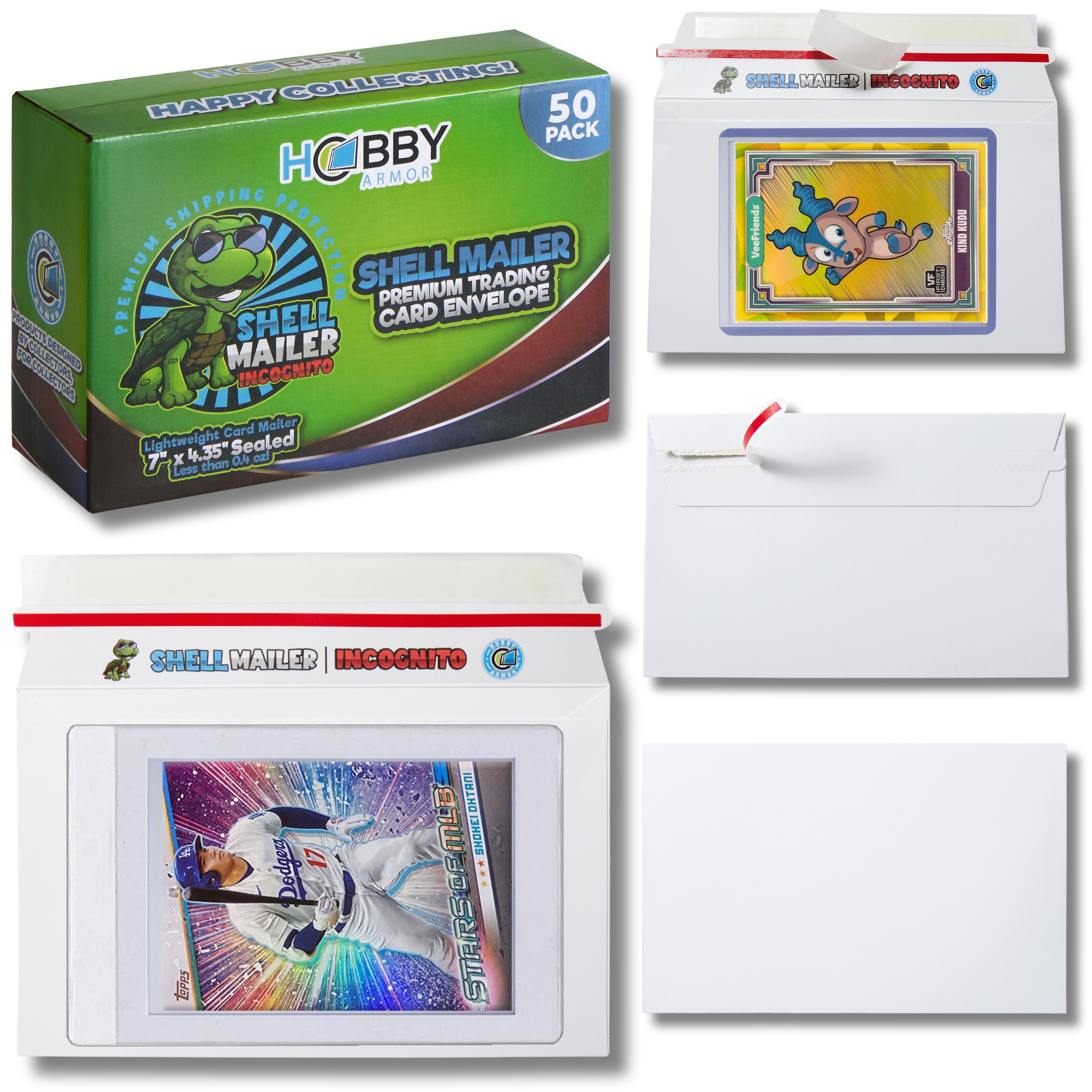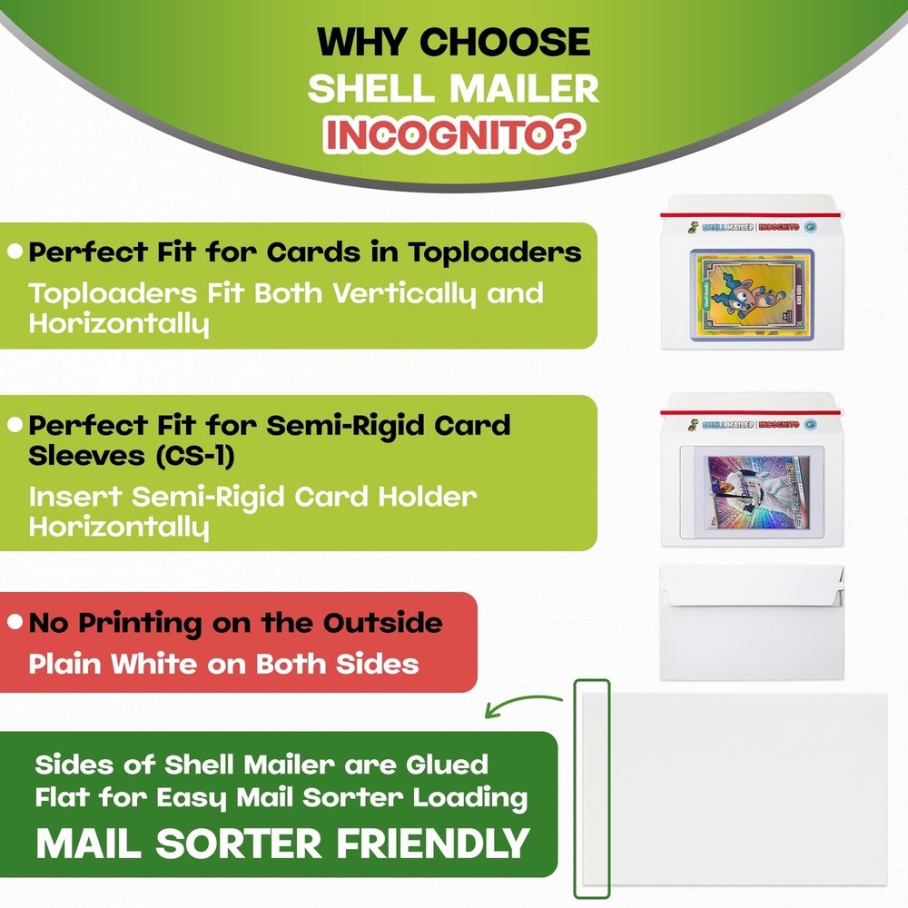 HIGH QUALITY Premium Trading Card Supplies FAST SHIPPING Quick Shipping, Happy Customers LOW PRICES Best Value on the Market! Shell Mailer Incognito by Hobby Armor - Premium Trading Card Envelopes - Mailers Introducing the Hobby Armor Shell Mailer Incognito, the lightweight, perfectly sized shipping envelope designed specifically for trading card enthusiasts. Measuring 7" x 4.35" and just 0.04" thick, these innovative trading card mailing envelopes weigh under 0.4 ounces, making them an ideal choice for efficient, cost-effective shipping. Whether you’re a long-time collector or a casual seller, the Shell Mailer Incognito provides a secure and professional way to ship valuable cards with confidence. The Shell Mailer Incognito is engineered to accommodate cards in both semi-rigid sleeves and standard toploaders, offering reliable protection during transit and helping prevent unwanted pressure, dings, or corner damage. These premium card-shipping protectors comply with the USPS Standard Envelope shipping guidelines, allowing you to upgrade your trading card shipments without complications or added hassle. Constructed from high-quality white cardboard, the Shell Mailer Incognito maintains maximum durability while keeping weight to an absolute minimum. This version features a plain white exterior with no outer print once sealed, creating a clean, discreet, professional appearance. This incognito design adds an extra layer of security by keeping the contents unidentifiable from the outside, perfect for protecting valuable trading cards. Premium trading card shipping supplies, the Shell Mailer Incognito is crafted by fellow collectors who understand the importance of reliable protection and smooth delivery. Each mailer is optimized for efficiency, helping you ship cards quickly, safely, and consistently. Perfectly sized for semi-rigid sleeves and toploaders, these card shipping envelopes streamline your process while enhancing your buyers’ unboxing experience. The Shell Mailer Incognito ensures you always have premium card-shipping materials ready for every order. Upgrade your trading card shipping with dependable, lightweight, professional-grade protection. Item Specifics Country/Region of Manufacture: United States Brand: Hobby Armor Similar items Hobby Armor Plastic Trading Card Shipping Protectors 3.5"x4.5", Multicolor Print $16.96 Hobby Armor Plastic Graded Card Shipping Protectors 4"x6", Multi-Color Print $19.96 Shell Mailer by Hobby Armor - Premium Trading Card Envelopes - Easy Card Mailers $18.99 Hobby Armor Cardboard Graded Card Shipping Protectors 4"x6" - Multi-Color Print $9.49 Hobby Armor Cardboard Trading Card Shipping Protectors 3.5"x4.5" - Multi-Color $7.99 Hobby Armor Bundle, Trading Card Shipping Protectors, 100 Unit Box of Each Size $34.96 Hobby Armor Samples Plastic Card Shipping Supplies 3.5x4.5 and 4x6 - 10 of Each $0.99 Hobby Armor Card Shipping Protectors 3.5" x 4.5" Trading Card Mailer 1000 Pack $119.99 Hobby Armor Graded Card Shipping Protectors 4" x 6" Trading Card Mailer 500 Pack $74.99 Hobby Armor Card Shipping Supplies 3.5 x 4.5 - 600 Units & SLIGHTLY DENTED BOX $67.99 Hobby Armor Trading Card Shipping Protectors 3.5" x 4.5" Cardboard - Box of 100 $22.99 Hobby Armor Graded Card Shipping Protectors 4" x 6" - Bundle - 200 Unit Box $44.99 Hobby Armor Plastic Graded Card Shipping Supplies 4" x 6" Translucent - 500 Pack $75.99 Hobby Armor Plastic Trading Card Shipping Protectors 3.5" x 4.5" - 500 Pack $75.99 Hobby Armor Graded Card Shipping Protectors 4" x 6" + Slab Storage Box 100 Pack $23.99 Hobby Armor Plastic Bundle - Card Shipping Supplies 3.5x4.5 & 4x6 - 100 of Each $35.99 Add suggested items to your listings - Check it out on 3Dsellers.com eBay listing template by 3D sellers.com - Try for Free!