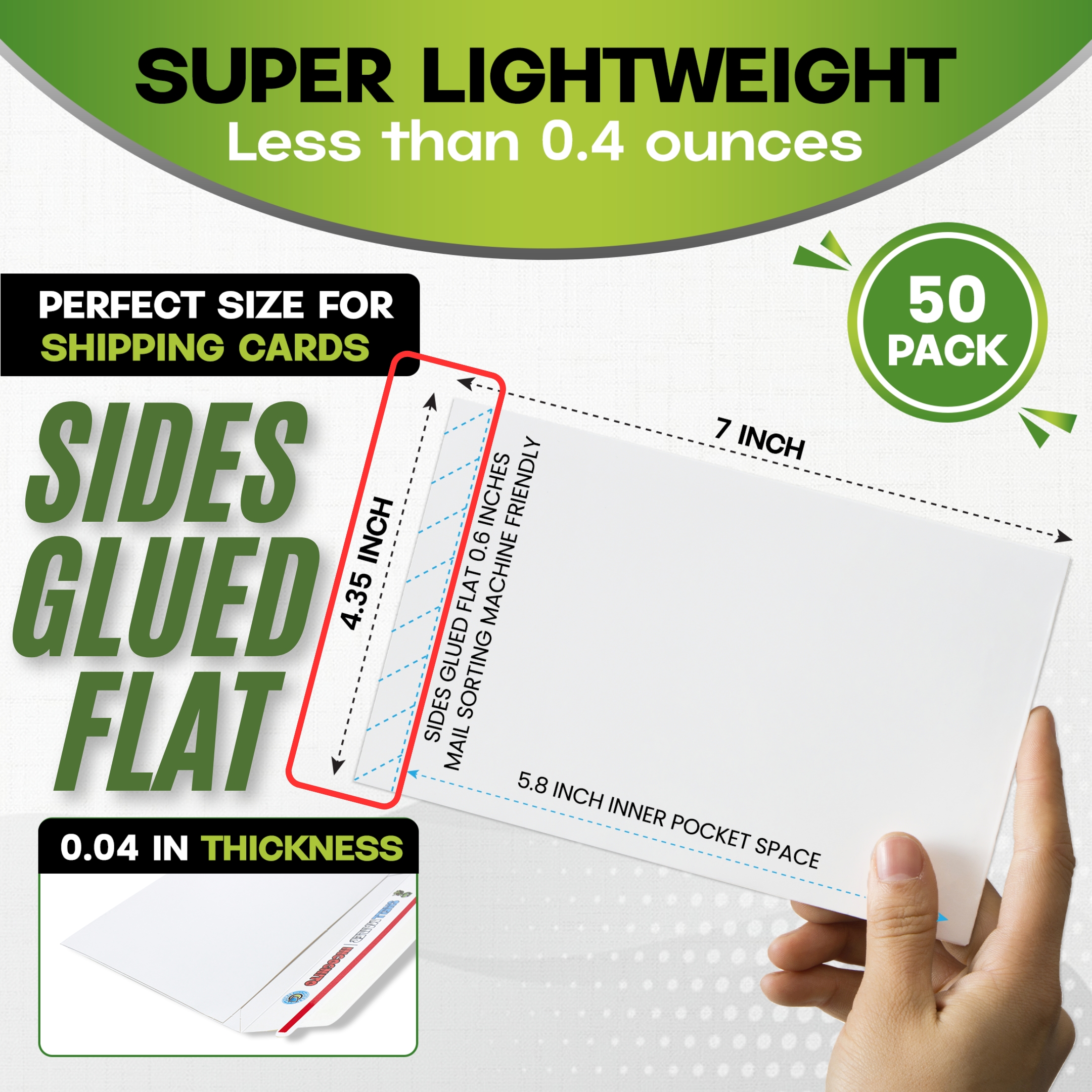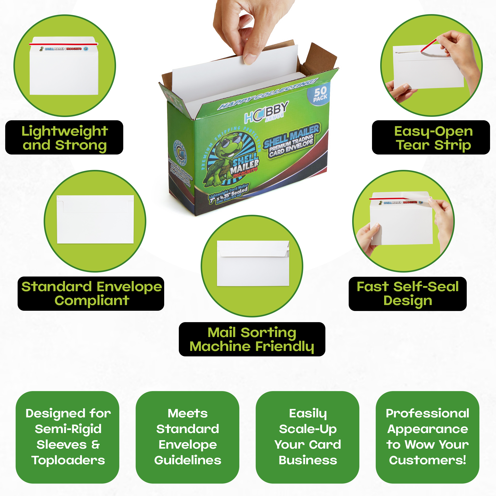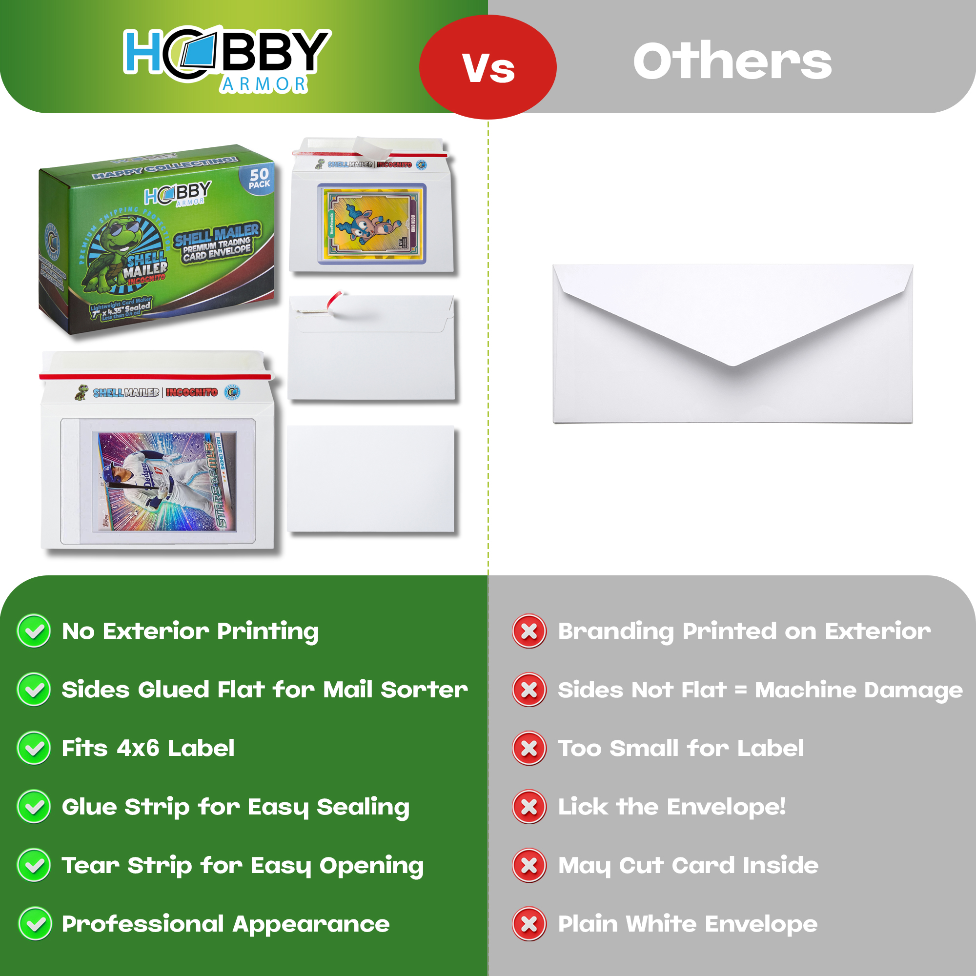 HIGH QUALITY Premium Trading Card Supplies FAST SHIPPING Quick Shipping, Happy Customers LOW PRICES Best Value on the Market! Shell Mailer Incognito by Hobby Armor - Premium Trading Card Envelopes - Mailers Introducing the Hobby Armor Shell Mailer Incognito, the lightweight, perfectly sized shipping envelope designed specifically for trading card enthusiasts. Measuring 7" x 4.35" and just 0.04" thick, these innovative trading card mailing envelopes weigh under 0.4 ounces, making them an ideal choice for efficient, cost-effective shipping. Whether you’re a long-time collector or a casual seller, the Shell Mailer Incognito provides a secure and professional way to ship valuable cards with confidence. The Shell Mailer Incognito is engineered to accommodate cards in both semi-rigid sleeves and standard toploaders, offering reliable protection during transit and helping prevent unwanted pressure, dings, or corner damage. These premium card-shipping protectors comply with the USPS Standard Envelope shipping guidelines, allowing you to upgrade your trading card shipments without complications or added hassle. Constructed from high-quality white cardboard, the Shell Mailer Incognito maintains maximum durability while keeping weight to an absolute minimum. This version features a plain white exterior with no outer print once sealed, creating a clean, discreet, professional appearance. This incognito design adds an extra layer of security by keeping the contents unidentifiable from the outside, perfect for protecting valuable trading cards. Premium trading card shipping supplies, the Shell Mailer Incognito is crafted by fellow collectors who understand the importance of reliable protection and smooth delivery. Each mailer is optimized for efficiency, helping you ship cards quickly, safely, and consistently. Perfectly sized for semi-rigid sleeves and toploaders, these card shipping envelopes streamline your process while enhancing your buyers’ unboxing experience. The Shell Mailer Incognito ensures you always have premium card-shipping materials ready for every order. Upgrade your trading card shipping with dependable, lightweight, professional-grade protection. Item Specifics Country/Region of Manufacture: United States Brand: Hobby Armor Similar items Hobby Armor Plastic Trading Card Shipping Protectors 3.5"x4.5", Multicolor Print $16.96 Hobby Armor Plastic Graded Card Shipping Protectors 4"x6", Multi-Color Print $19.96 Shell Mailer by Hobby Armor - Premium Trading Card Envelopes - Easy Card Mailers $18.99 Hobby Armor Cardboard Graded Card Shipping Protectors 4"x6" - Multi-Color Print $9.49 Hobby Armor Cardboard Trading Card Shipping Protectors 3.5"x4.5" - Multi-Color $7.99 Hobby Armor Bundle, Trading Card Shipping Protectors, 100 Unit Box of Each Size $34.96 Hobby Armor Samples Plastic Card Shipping Supplies 3.5x4.5 and 4x6 - 10 of Each $0.99 Hobby Armor Card Shipping Protectors 3.5" x 4.5" Trading Card Mailer 1000 Pack $119.99 Hobby Armor Graded Card Shipping Protectors 4" x 6" Trading Card Mailer 500 Pack $74.99 Hobby Armor Card Shipping Supplies 3.5 x 4.5 - 600 Units & SLIGHTLY DENTED BOX $67.99 Hobby Armor Trading Card Shipping Protectors 3.5" x 4.5" Cardboard - Box of 100 $22.99 Hobby Armor Graded Card Shipping Protectors 4" x 6" - Bundle - 200 Unit Box $44.99 Hobby Armor Plastic Graded Card Shipping Supplies 4" x 6" Translucent - 500 Pack $75.99 Hobby Armor Plastic Trading Card Shipping Protectors 3.5" x 4.5" - 500 Pack $75.99 Hobby Armor Graded Card Shipping Protectors 4" x 6" + Slab Storage Box 100 Pack $23.99 Hobby Armor Plastic Bundle - Card Shipping Supplies 3.5x4.5 & 4x6 - 100 of Each $35.99 Add suggested items to your listings - Check it out on 3Dsellers.com eBay listing template by 3D sellers.com - Try for Free!