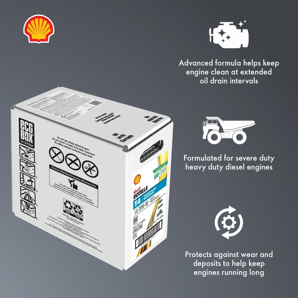Shell Rotella T4 Triple Protection 15W-40 Diesel Engine Oil, 3 Gallon Triple Protection : This 15W-40 diesel engine oil features Triple Protection technology, safeguarding against wear, deposits, and oil breakdown for enhanced engine efficiency and longevity. Advanced Formulation : Formulated with advanced additive technology and synthetic base oil, it ensures superior engine cleanliness and enhanced deposit control throughout the oil drain interval. Shear Stability : Provides enhanced shear stability, contributing to better viscosity control and maintaining optimal engine oil pressure. Heavy-Duty Applications : Offers outstanding protection for heavy-duty diesel engines, including those with emission controls, and is suitable for agricultural, mining, logging, construction, and diesel pickup trucks. Industry Compliance : Meets or exceeds numerous industry requirements, including API CK-4, CJ-4, and SN, as well as OEM specifications from Caterpillar, Cummins, Detroit, and Volvo.