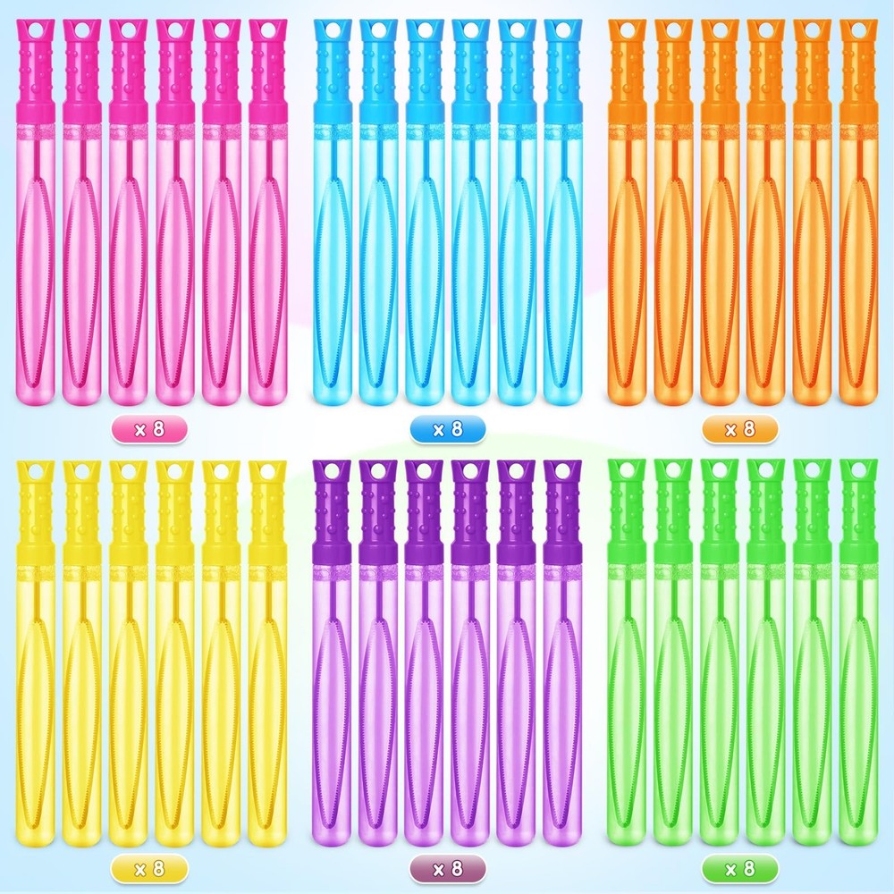 Shemira 48 Pack Bubble Wands in 6 Colors, Bulk Party Favor Assortment Toys for Kids, Carnival Prizes, Themed Birthday, Wedding, Summer Outdoor Toys for Girls & Boys, Ideal Goodies Bags Stuffers Product Details Style: 48PACK Brand: Shemira MPN: SH-BubbleWand-2oz48 UPC: Does not apply EAN: Does not apply Product Dimensions: 10 x 7 x 0.5 inches Item Weight: 9.06 pounds Country of Origin: China Manufacturer recommended age: 3 years and up Manufacturer: Shemira Super Value Package - The package contains 48 neon bubble wands in 6 eye-catching bright vibrant colors, which have enough quantity to meet different needs of parties. A sturdy colorful box with double pearl cotton packaging will make sure every product is delivered in good condition and won't have any leak problems. Decent Size for everyone: It's hard to imagine that a 2oz tube can provide so much joy. Not just perfect for little hands, but fits everyone. Each wand provide 30mins playtime at least, Not too much bubble liquid to clean up when kids drop the container. Not as messy as the traditional bubbles.Easy to use, refillable, very useful and practical. Perfect For Holiday Supplies - These mini bubble wands are easy to fit into a variety of gift bags, perfect for goodie bags, easter egg fillers, gift boxes stuffers and school classroom game prizes. It is the ideal boy & girl gifts for Valentine's Day, Easter basket, Christmas, Halloween goody bag, treat or trick gifts, Thanksgiving, New Year, 4th of July, Thanksgiving. Kids Party Favor- Everyone loves bubbles. These presentable bubble wands will make you the most popular host, it provides fun for kids at various themed parties. Bulk bubble wands are perfect for stocking stuffers, party favors, baby shower parties, birthday party games, carnival party, family reunion, graduation party, wedding, gathering, travel camping or summer outdoor activities, handouts or rewards, school classroom prizes for kids. Safe Bubble Wands for 3+ Year Old Kids - The bubble solution is made from a non-toxic and odorless soap solution, this bubble solution is very safe for children's skin and face, you can give it to kids with confidence(DO NOT DRINK). If you have any questions, please feel free to contact us. We will reply to you within 24 hours.