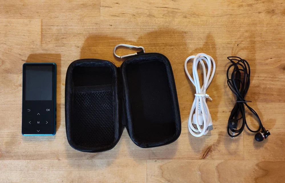 Shenzhen MP3 Player, 64 GB, FM Radio, Lossless Music, Bluetooth, microSD Slot. Includes wired earbuds, data cable, and hard shell case. Works as new. I used a 512 GB card in it with no problem.