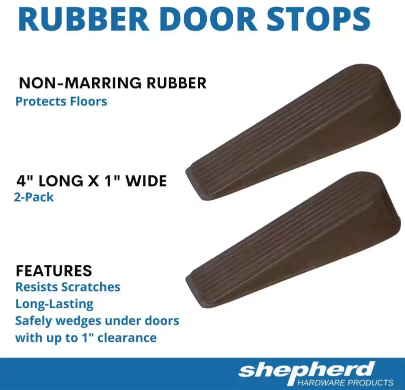 Shepherd Brown Rubber Door Stops, Heavy Duty, Floor Protection (2-Pack) These Shepherd Brown Wedge Doorstops (2-Pack) hold doors open in the home, featuring non-marring rubber to protect floors. The wedges resist sliding, keeping doors secure. Includes 2 door stops. Control swinging doors and protect walls with versatile door wedges. Lightweight rubber construction for discreet protection. Non-marking rubber material grips hard floors, carpet, and outdoor surfaces. Safely wedges under doors with up to 1-inch floor clearance. 4-inch long x 1-inch wide brown rubber wedges, 1-1/8 inches tall - 2 Pack. FEATURES Product Depth (in.): 4 in Product Height (in.): 1.125 in Product Thickness (mm): 0.125 Product Width (in.): 1 in Pull Projection (in.): 4 in Builders Hardware Product Type: Door Stop Catch included: No Door stop type: Rubber wedge Fasteners included: No Finish: Brown Hardware Color Family: Brown Hardware Finish Family: Brown Material: Rubber Package Quantity: 2 Returnable: 30-Day RETURNS We offer a 30 day return/exchange policy for most of our products. You can request a refund if you are dissatisfied for any reason with your product. (Restocking Fee May Apply). Only factory defects are accepted as a reason for a return. When returning an item, it must be in all of the original packaging and include all of the original accessories or items that came with it. You will be required to cover shipping on the return of non-defective items. All returns MUST be done within 30 days of date of purchase. Please note that we cannot give refunds or replacements after the 30 day limit has expired. When sending in a return, please note that it can take up to 7 business days for the return to be processed. SHIPPING We provide fast, free shipping. Most items are shipped within 1-2 business days of receiving cleared payment. We ship to the lower 48 contiguous United States only. We do not ship to P.O. Boxes or APOs. For select items, we ship internationally through eBay?s Global Shipping Program. We do ship most of our smaller items internationally using eBays Global Shipping Program. Certain restrictions apply. Standard or Economy Shipping is ALWAYS FREE! You will be notified via eBay messages as soon as your items ship. Special Notice for Freight Items: If an item ships via Freight (Truck) Delivery, a valid phone number will be required so that we can contact you to schedule delivery. Please be sure to have available help on hand to assist you with moving the item to the desired location in or outside of your home. In the unlikely event that damaged is observed, you MUST refuse delivery and note the damage on the shipping receipt and send it back via the Freight carrier. Returns will not be accepted on Freight item s after they have been delivered, inspected, and the driver has left the premises.