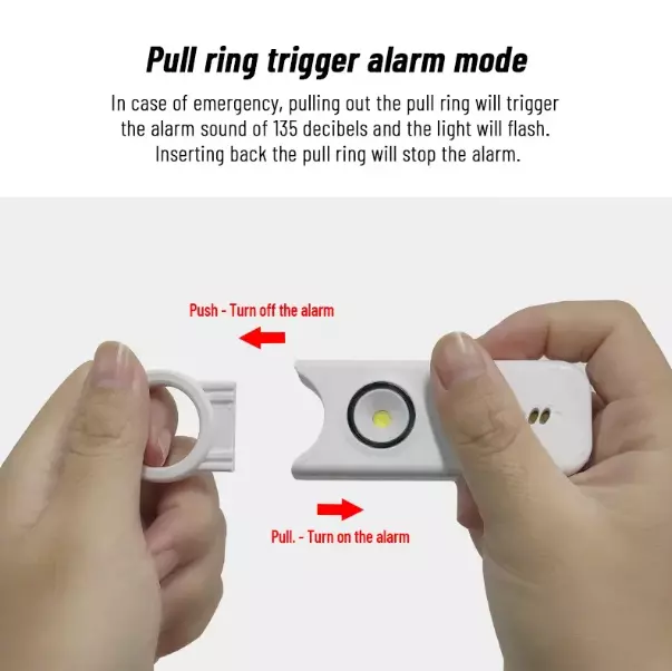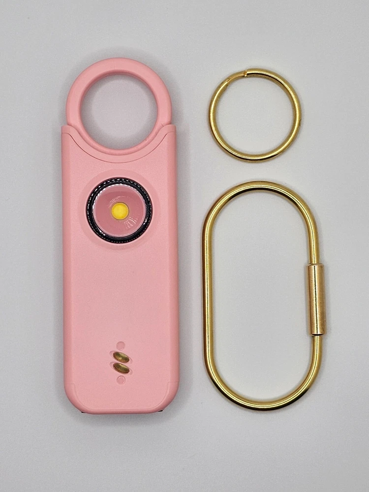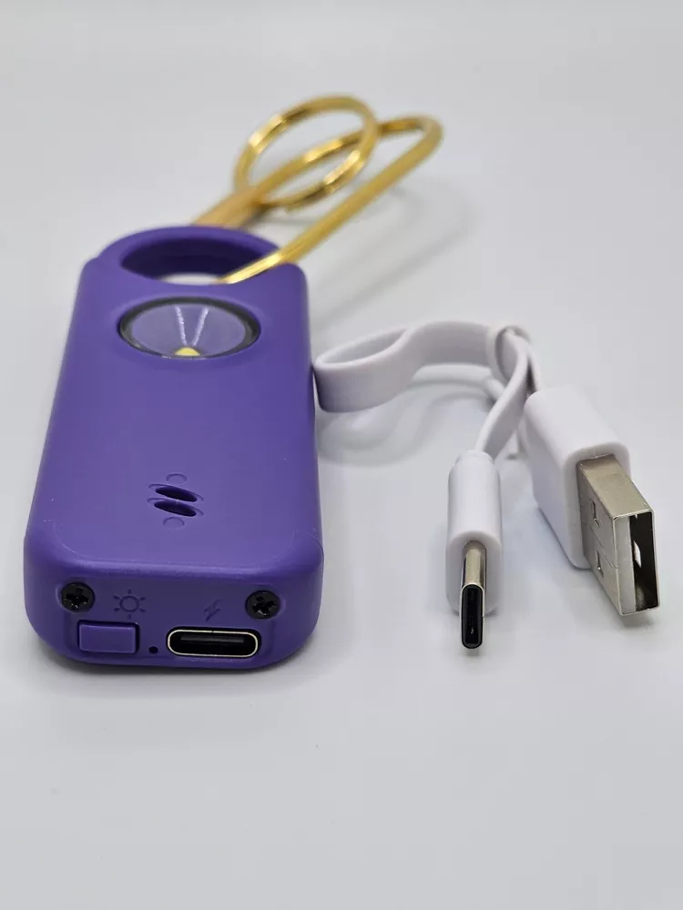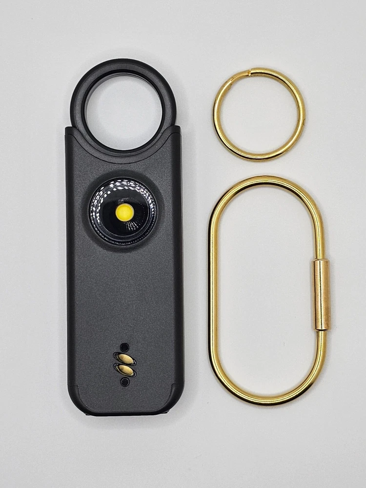 Protect yourself with this multifunctional keychain featuring a powerful 135dB siren and an LED light. Great self-defense tool for men, women, kids, students, and elderly. Deters attackers and alerts people nearby to come to your aid. Adds an extra layer of safety and security while traveling, jogging, hiking, walking the dog, etc. LIGHT: Light serves dual purposes, aiding in locating items in your purse/car or illuminating your path. Easily toggle between flashlight mode with a single click and flashing strobe light with two clicks. SIREN: Pull latch to sound alarm; light will flash at same time. Restore latch to stop alarm. Also equipped with motion-sensor mode: Press and hold LED light button for 3 seconds to activate—perfect for hanging on hotel doors—siren and light will activate upon sensoring motion. Press button again to turn off. Benefit from up to 1 hour of active alarm, 2 hours of illumination, and 3 years of standby time on the USB-C rechargeable battery. INCLUDES: USB-C Cord, Carabiner, and Key Ring.