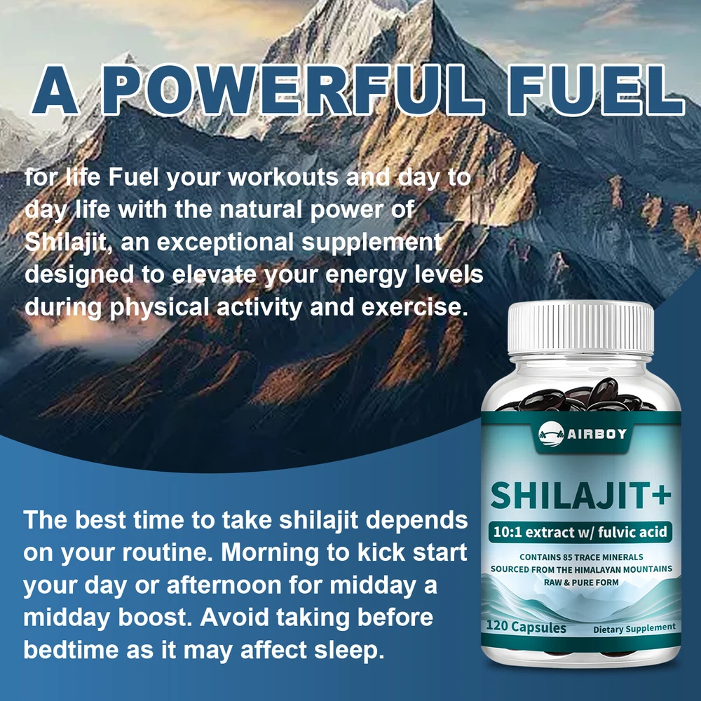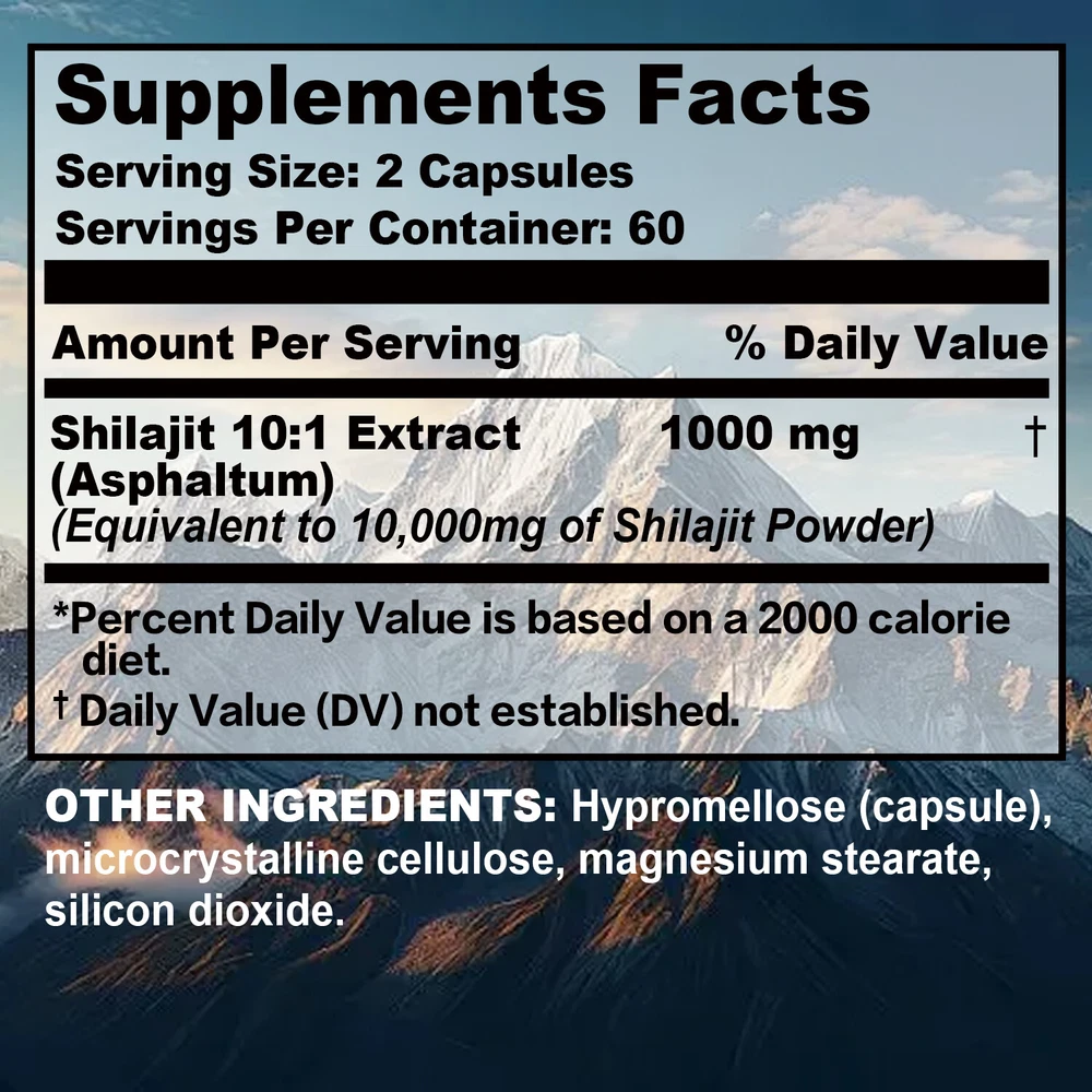Effects: Anti-fatigue, Energy & Endurance Ingredients: Shilajit Directions: Take 2 capsules once daily after a meal. Shipping: Ships within 48 hours on working days. Shelf life: 2 years Description: Our Shilajit capsules are a natural and effective brain enhancer that improve cognitive function and mental clarity. Shilajit also helps fight fatigue, muscle recovery, energy production, heart health, hormonal balance, improves endurance and improves mood. Powerful Antioxidant - Shilajit is a natural source of trace minerals and fulvic acid. Fulvic acid is an antioxidant that aids in cell regeneration and metabolism. PREMIUM QUALITY - Our capsules are manufactured in a GMP certified factory to ensure high quality, and independently tested by a third party. Non-GMO, free of gluten, wheat, dairy, sugar, soy and yeast. Document