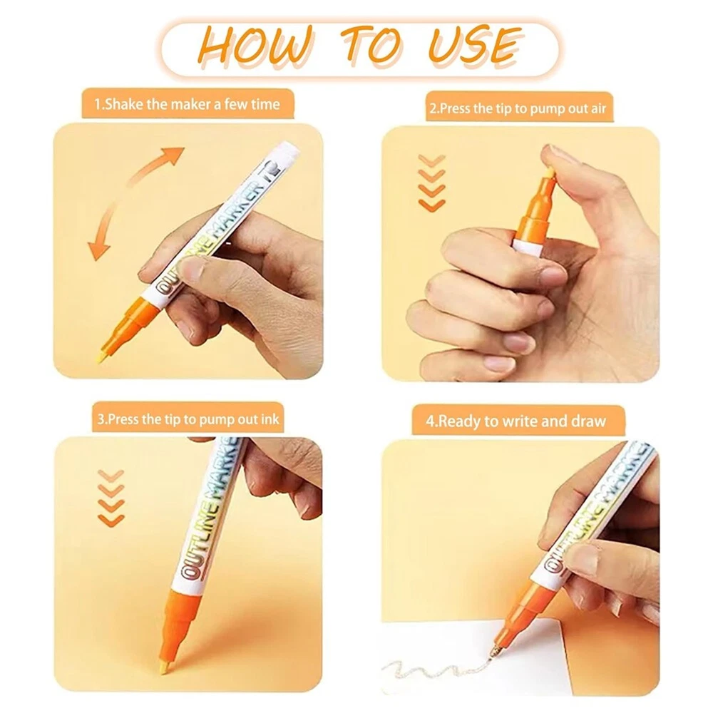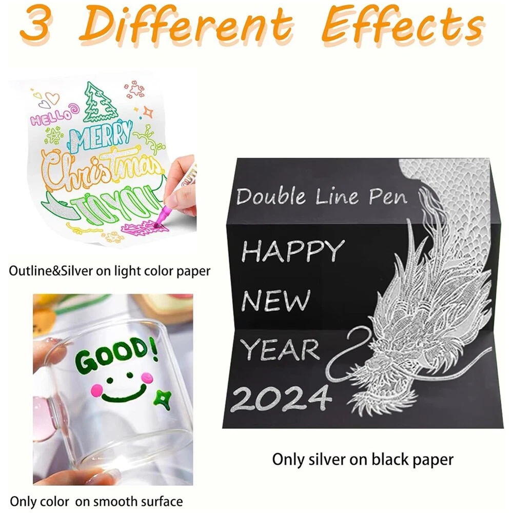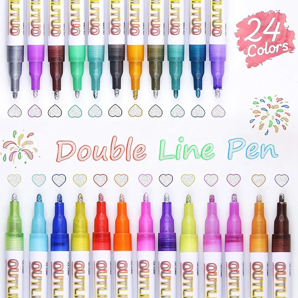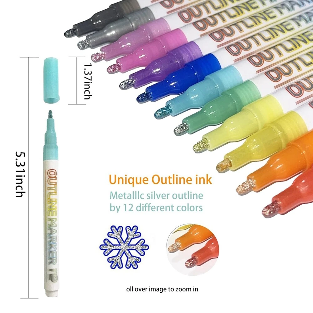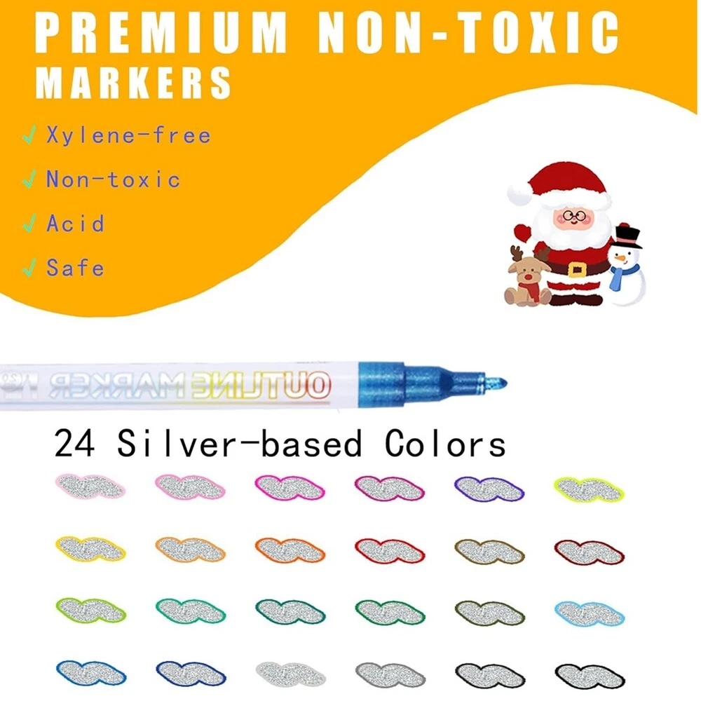 Shimmer Markers, 24 Colors Metallic Outline Glitter Pens Set for Kids and6157 [24 COLORS GLITTER MARKERS]Metallic silver outline markers come with 24 unique and vibrant color options to choose from, NO duplicate.Unique technology produces outlines automatically to create a beautiful dual-color effect [SMOOTH WRITING & NON_TOXIC ]These glitter markers are water-based, non-, odorless, smooth flow, quick-drying, high quality certificated ink and safe for kids and adults. The 2-3mm medium soft tip for shading and quickly color in large areas art project [GREAT For ANY PROJECT]Sparkly outline pens work best on thick white paper, but their permanent metallic ink can be effective on almost any surfaces. It's perfect for Cristmas cards, birthday card, holiday cards, gift tags, sign, easter eggs, envelopes, poster and for any application! [EASY TO USE]Before uncapping, give the shimmer marker a few shakes. Then press down a few times to activate the ink flow. Please re-cap the markers immediately after use and store horizontally for your next masterpiece [FUN FOR ALL AGES]Great gift idea for Christmas, Birthday, Mother's Day, Easter Day, Graduation, Thanksgiving, New Year or anyone who loves drawing, journaling, crafting, doodling, illustrations. Both beginners and professionals can better release your creativity.( we suggest children under 3-years old should be used under the supervision of an adult) Material: plastic colour: As Shown Package Contents: 24 x Shimmer Markers