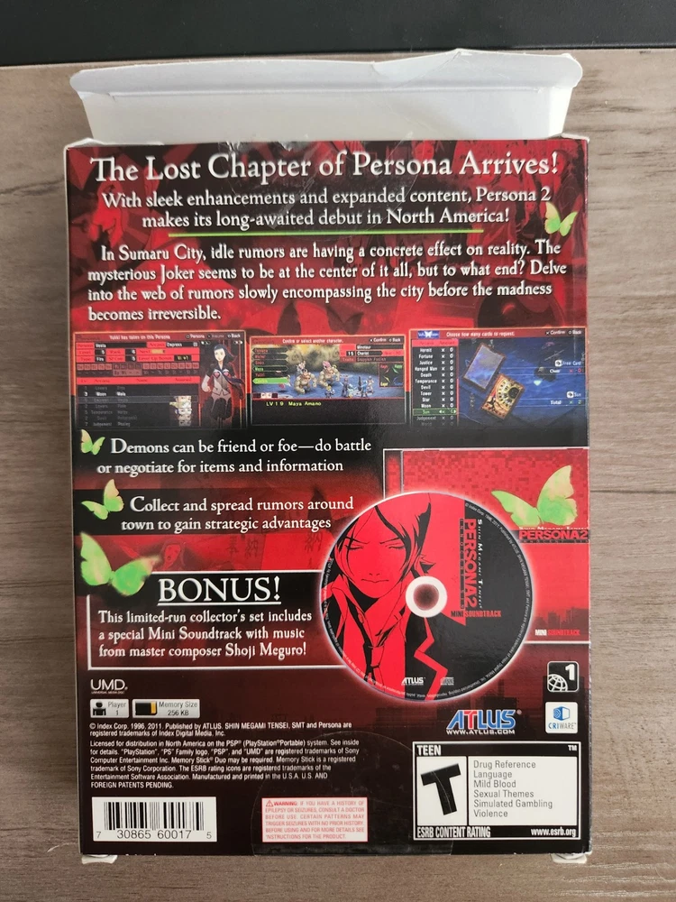 Shin Megami Tensei: Persona 2 Innocent Sin Limited Edition w/Soundtrack Complete in Box Tested and Works There is a crease on one of the flaps to open the box Please see pictures Priority Mail Shipping Returns or Refunds will not be accepted for this item.