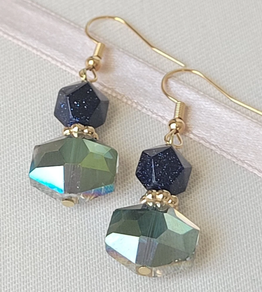 Add a touch of elegance to any occasion with these beautifully crafted Shiny Lady swing earrings. The intricate design features aurora crystal face cut beads in a mesmerizing night blue shade, paired with glass bead accents for a touch of added sparkle. These handmade earrings have a 1.7" length. Perfect for gifting on occasions. The stylish earrings come in a pair and are sure to add a cool and sophisticated touch to any lady's wardrobe. Ship FREE with USPS Ground Advantage