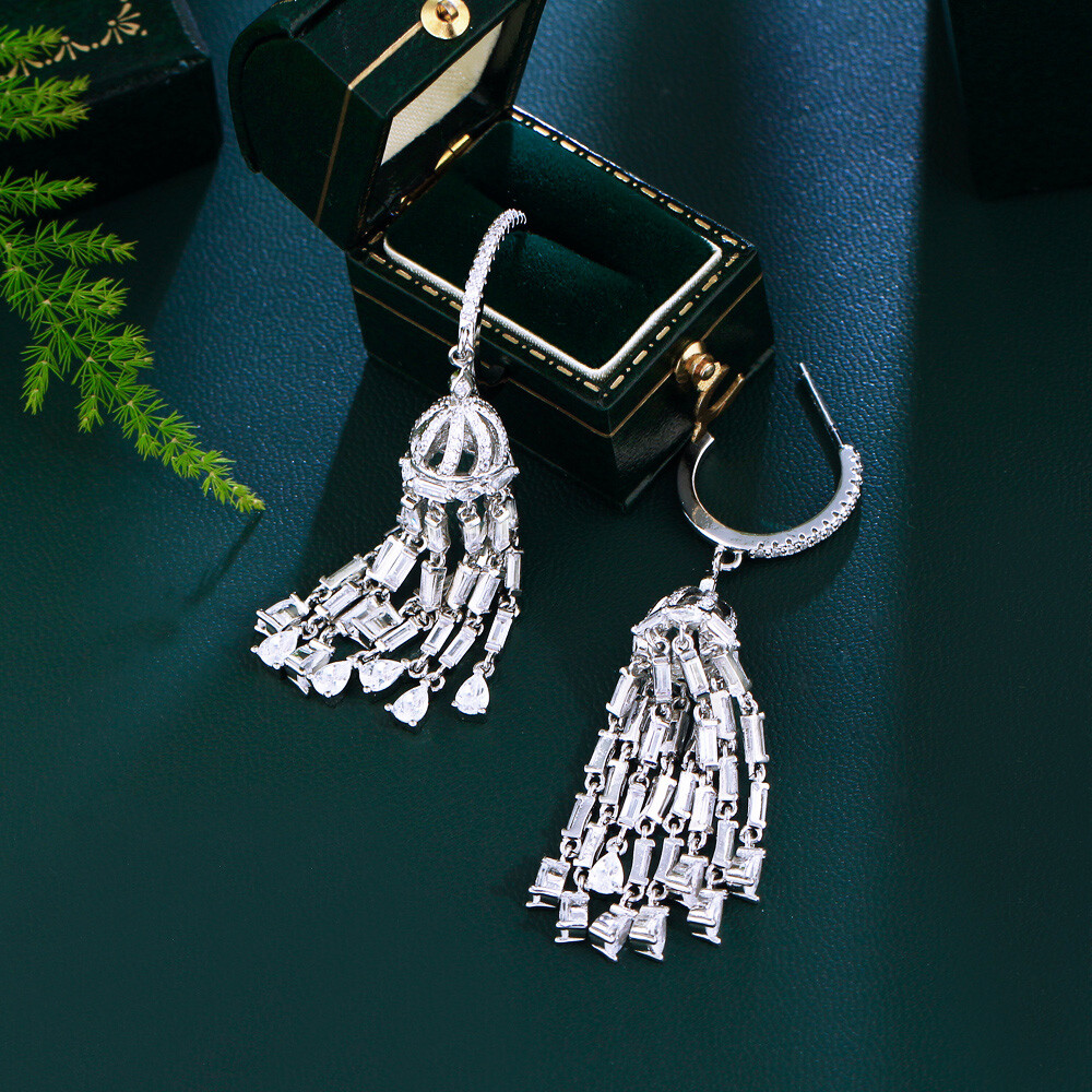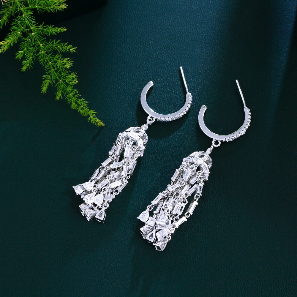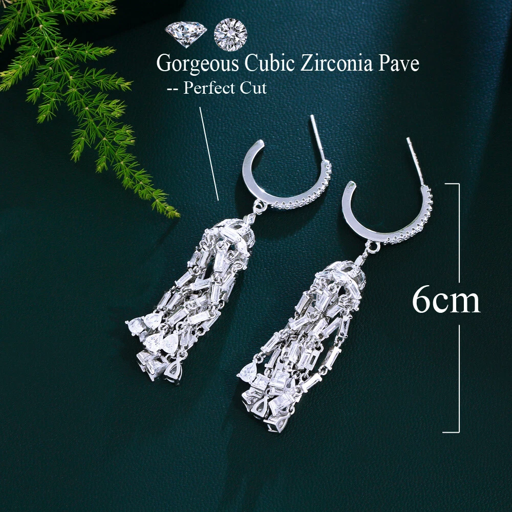 Shiny Silver Plated Cubic Zirconia Long Tassel Dangle Earrings for Women Wedding