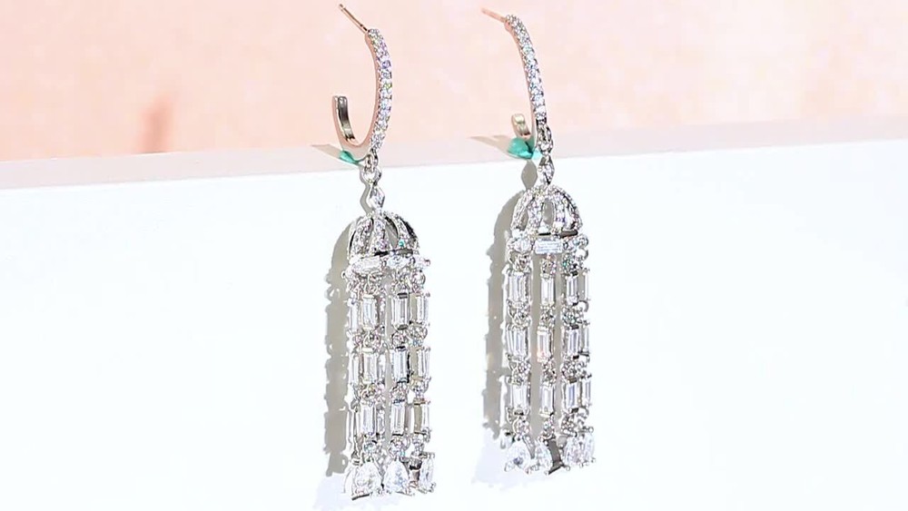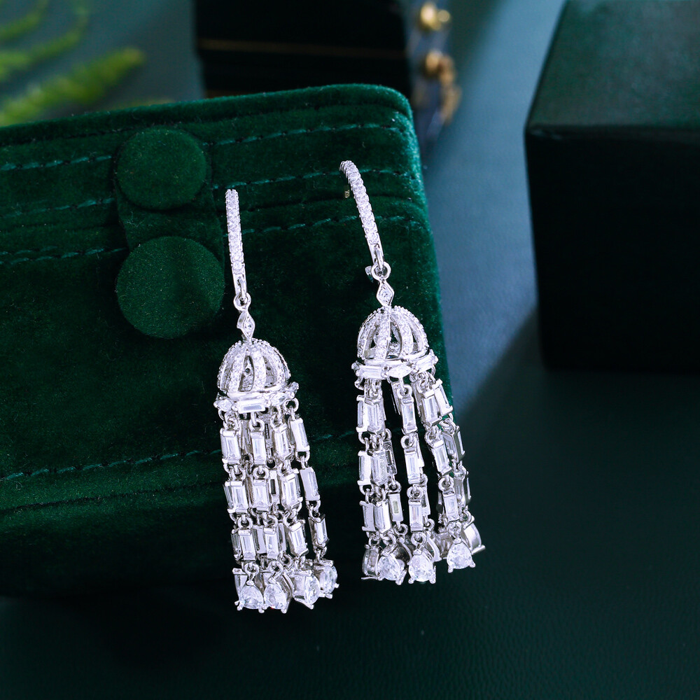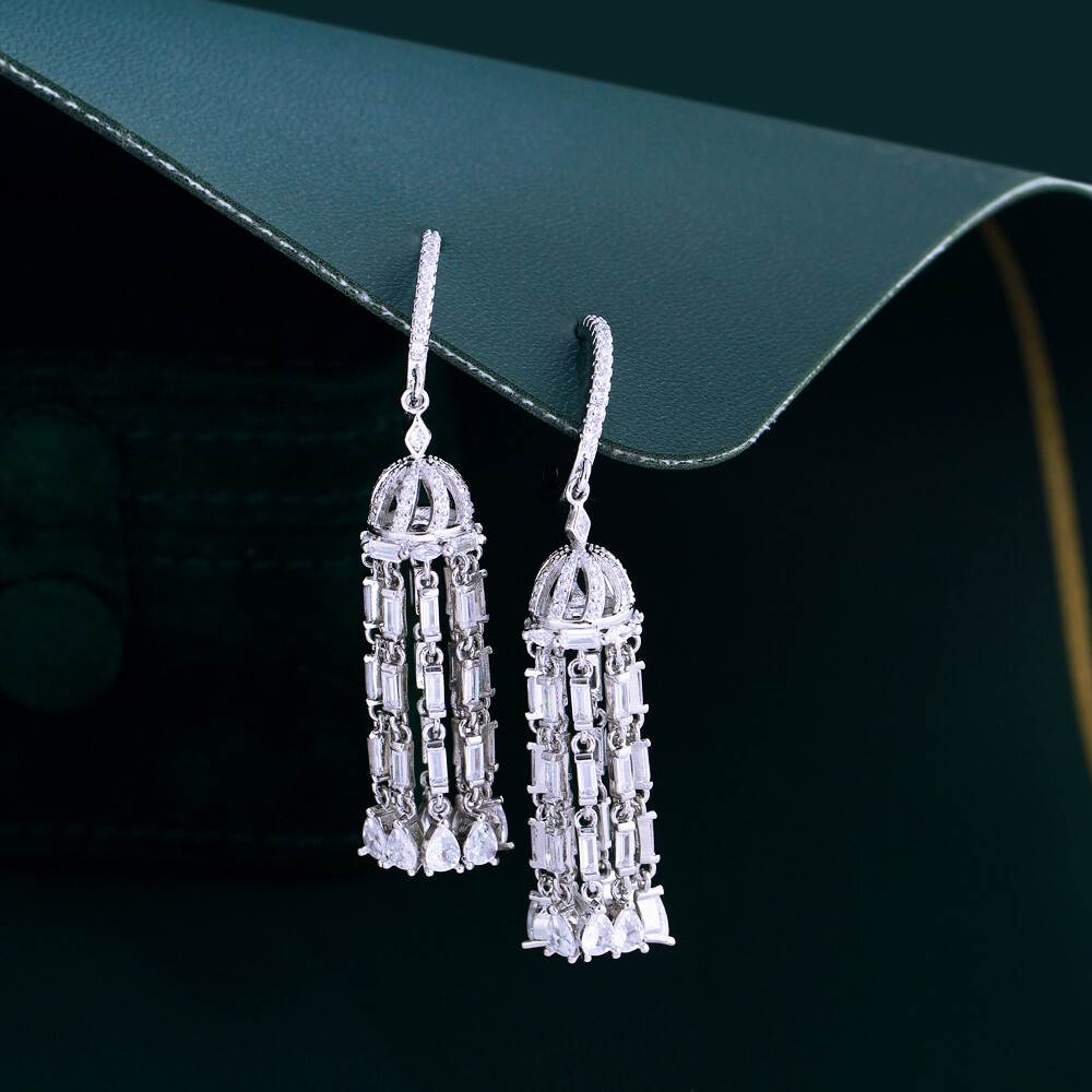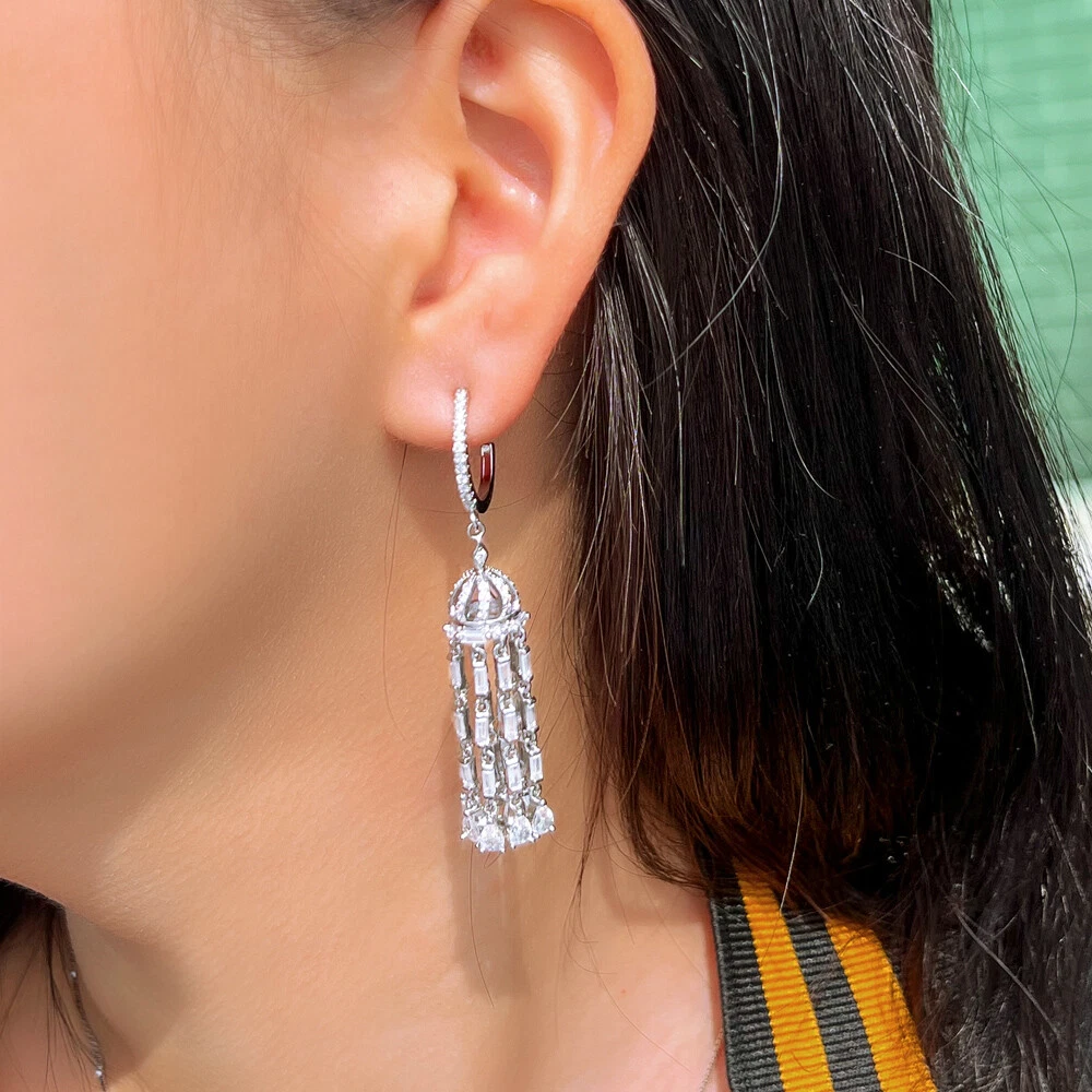 Shiny Silver Plated Cubic Zirconia Long Tassel Dangle Earrings for Women Wedding