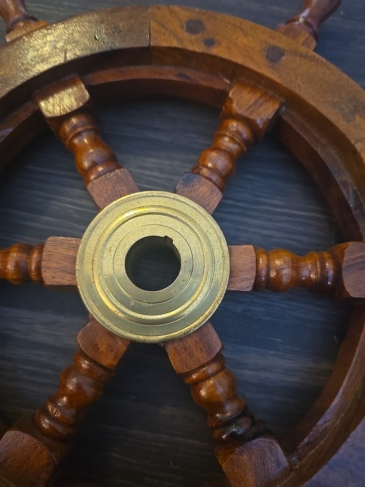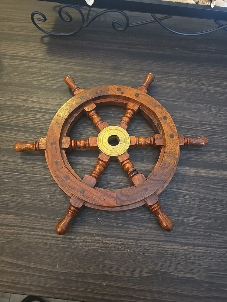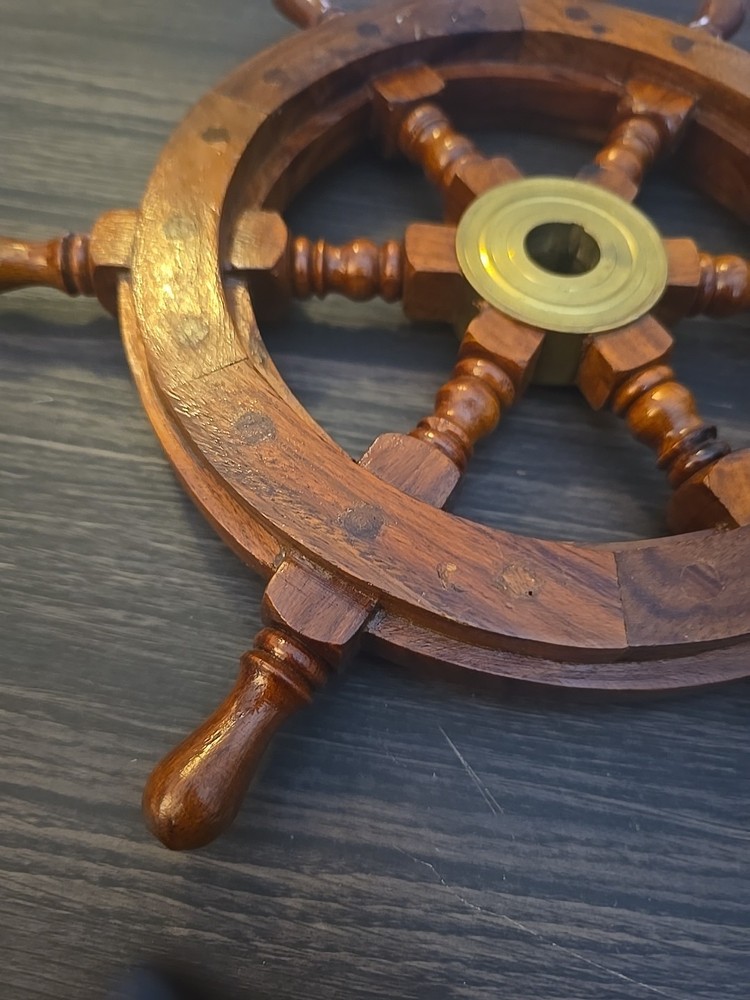 The product is a wooden and brass ship's wheel wall decor with a traditional maritime style design, measuring 13 inches in height. It is a decorative piece that adds a nautical touch to any home or office space. The combination of wood and brass materials gives it a sturdy and timeless appearance, perfect for those who appreciate maritime aesthetics in their decor. Perfect for coastal or nautical-themed rooms, this ship's wheel would make a unique and eye-catching addition to any space.