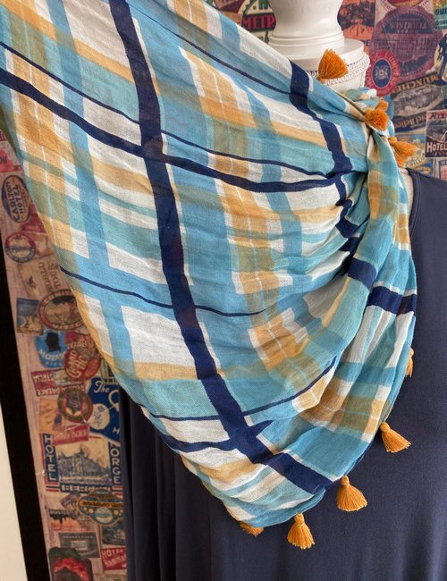 Shiraleah Plaid Infinity Scarf with Tassels in Blue Orange White