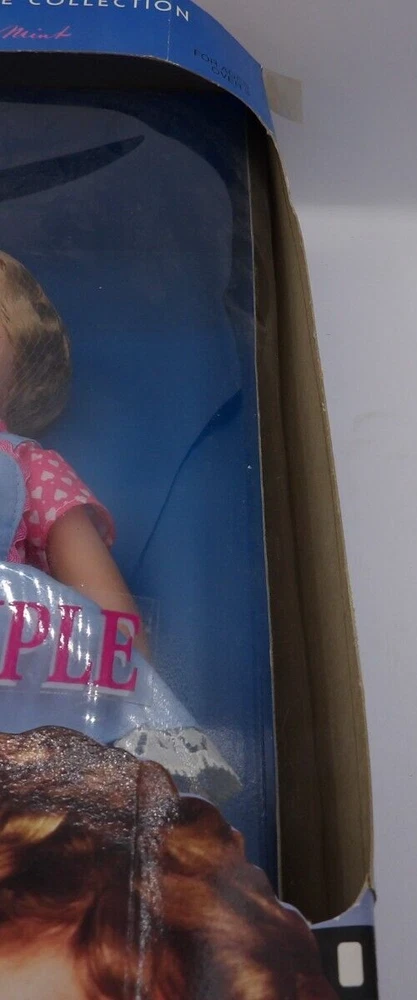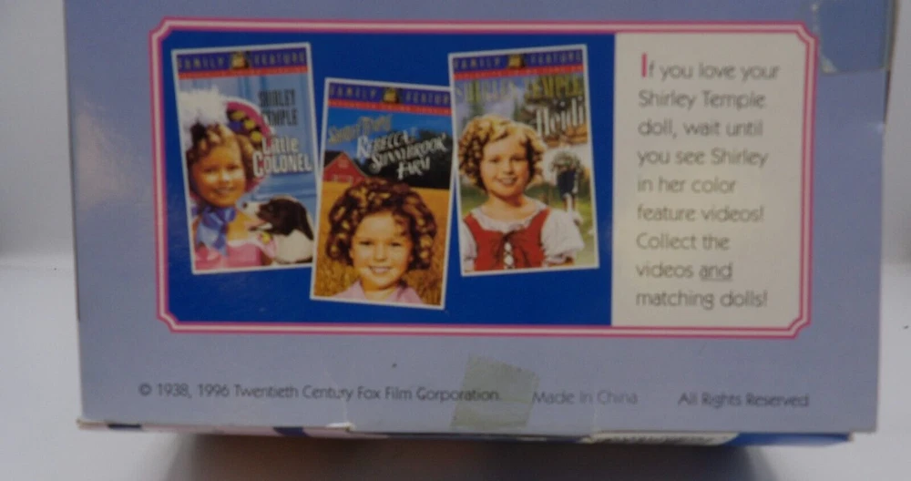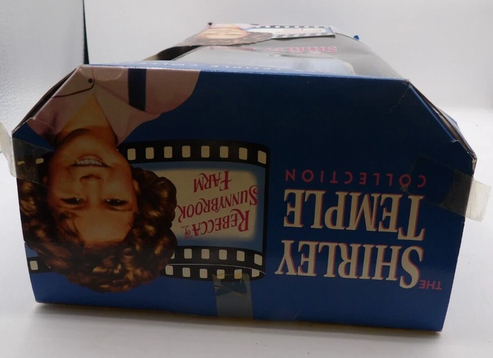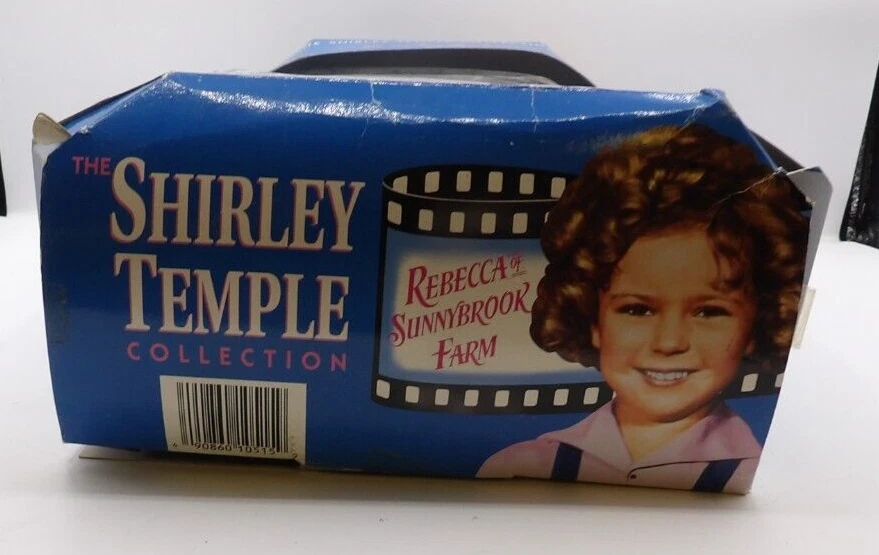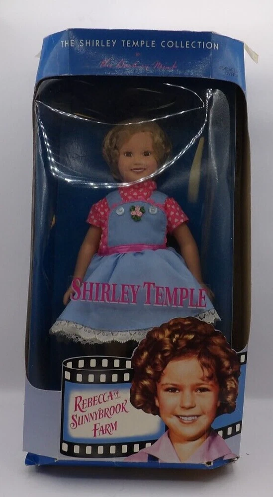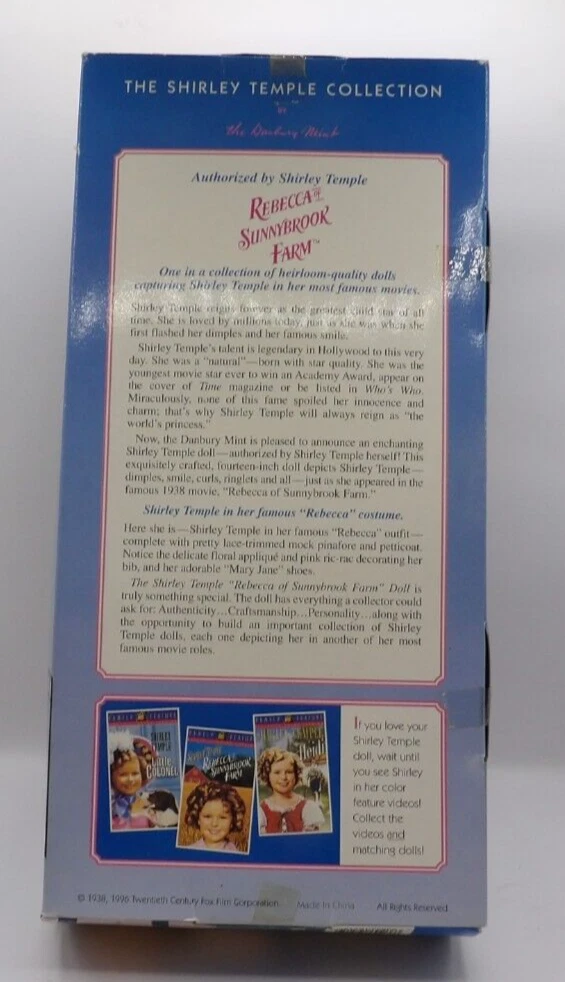 This Shirley Temple doll "Rebecca of Sunnybrook Farm" was made by Danbury Mint © 1938/1996 Twentieth Century Fox Film Corp. Made in China. NOS- Doll is still attached to backing, but the doll has damage- see photos please. Her face is porcelain and her body arms and legs are plastic.14" tall.