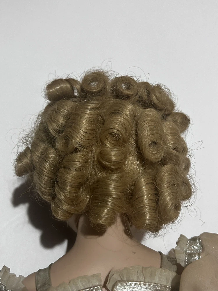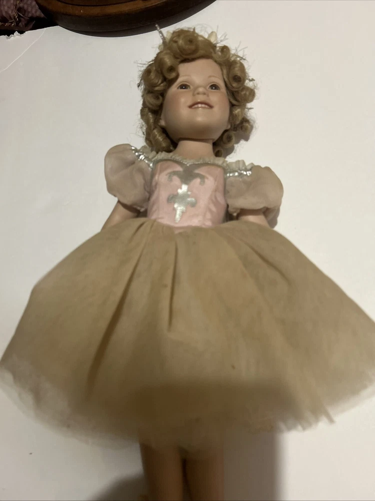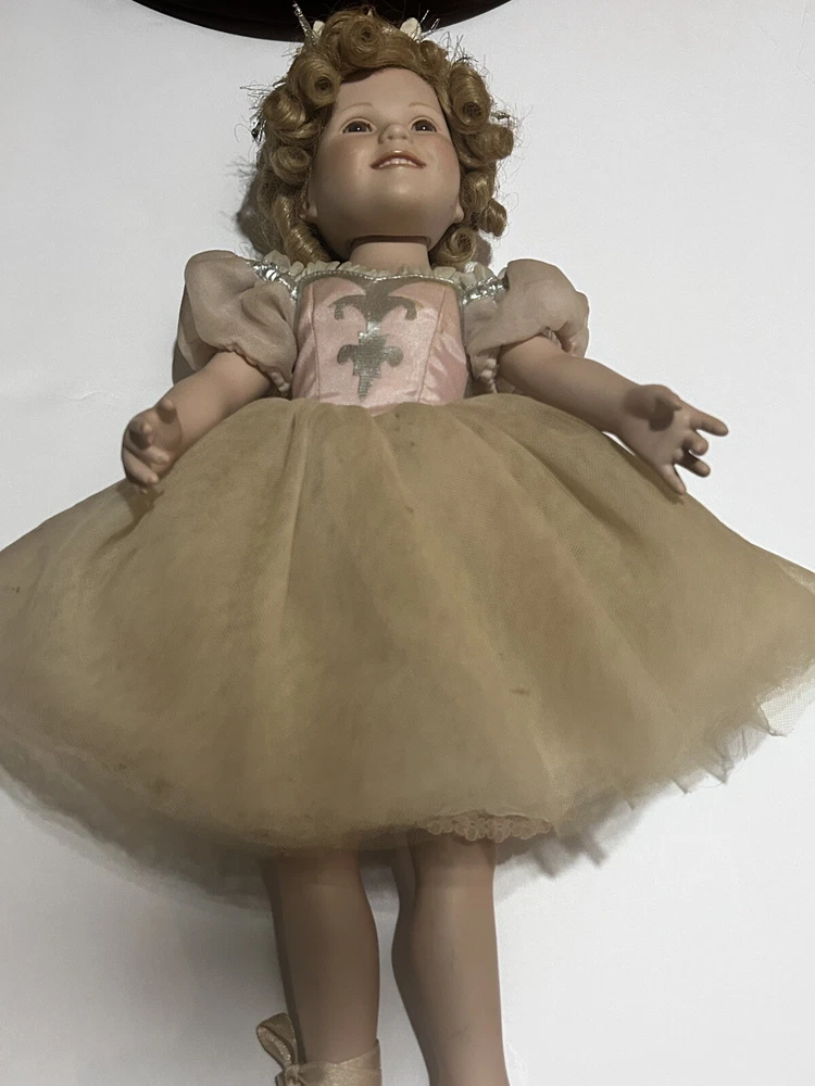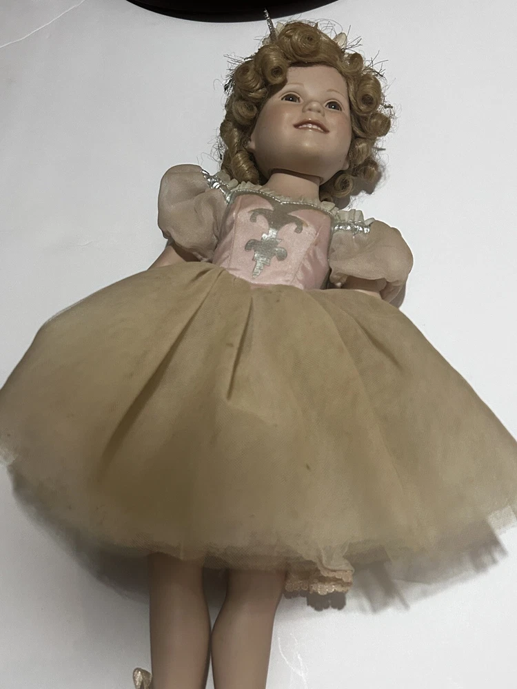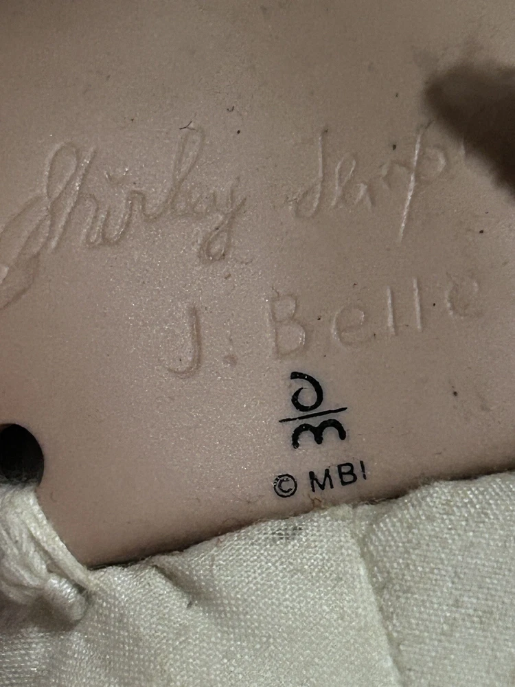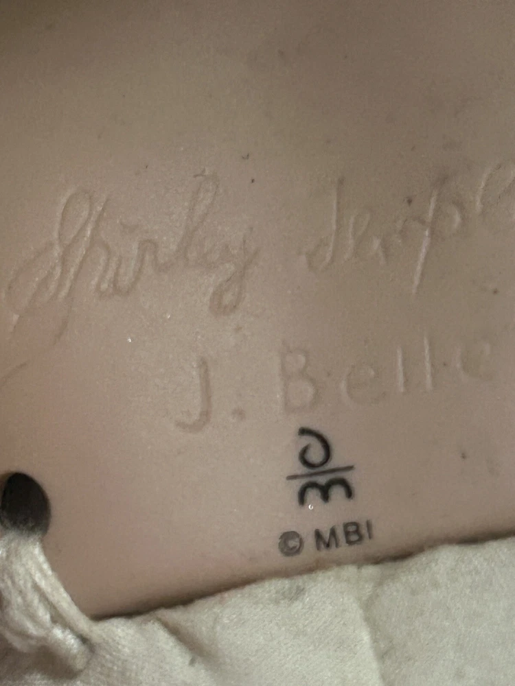 This Shirley Temple doll is signed on the back of the neck J Belle . She is missing one of her shoes. I don’t know how old she is. Her dress looks like it needs cleaned, but her curls are all intact and her teeth are pretty. There’s no tears on her dress and the flowers are all in her hair at her dress looks like it should be cleaned and it is removable .