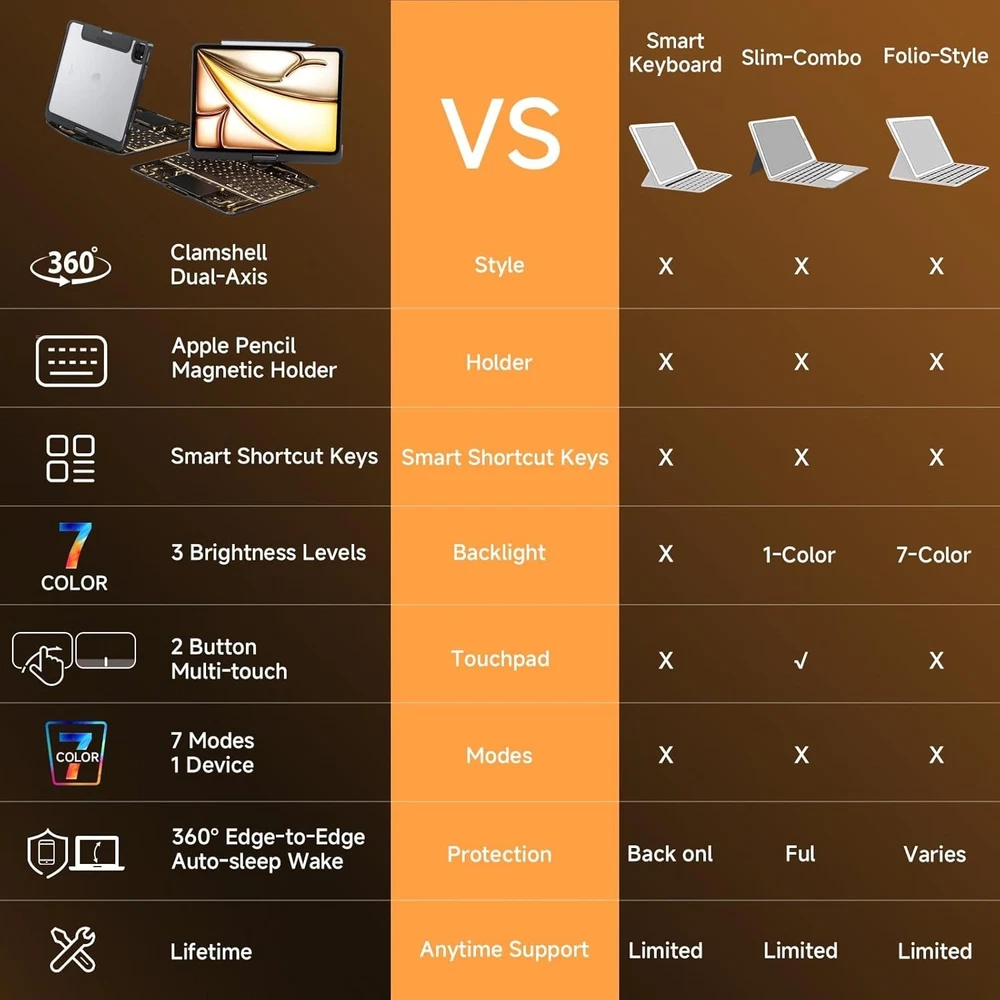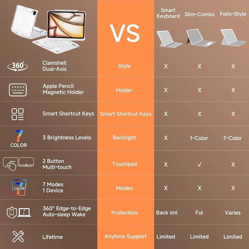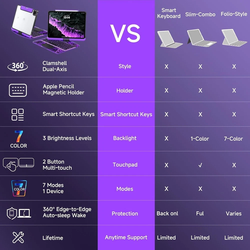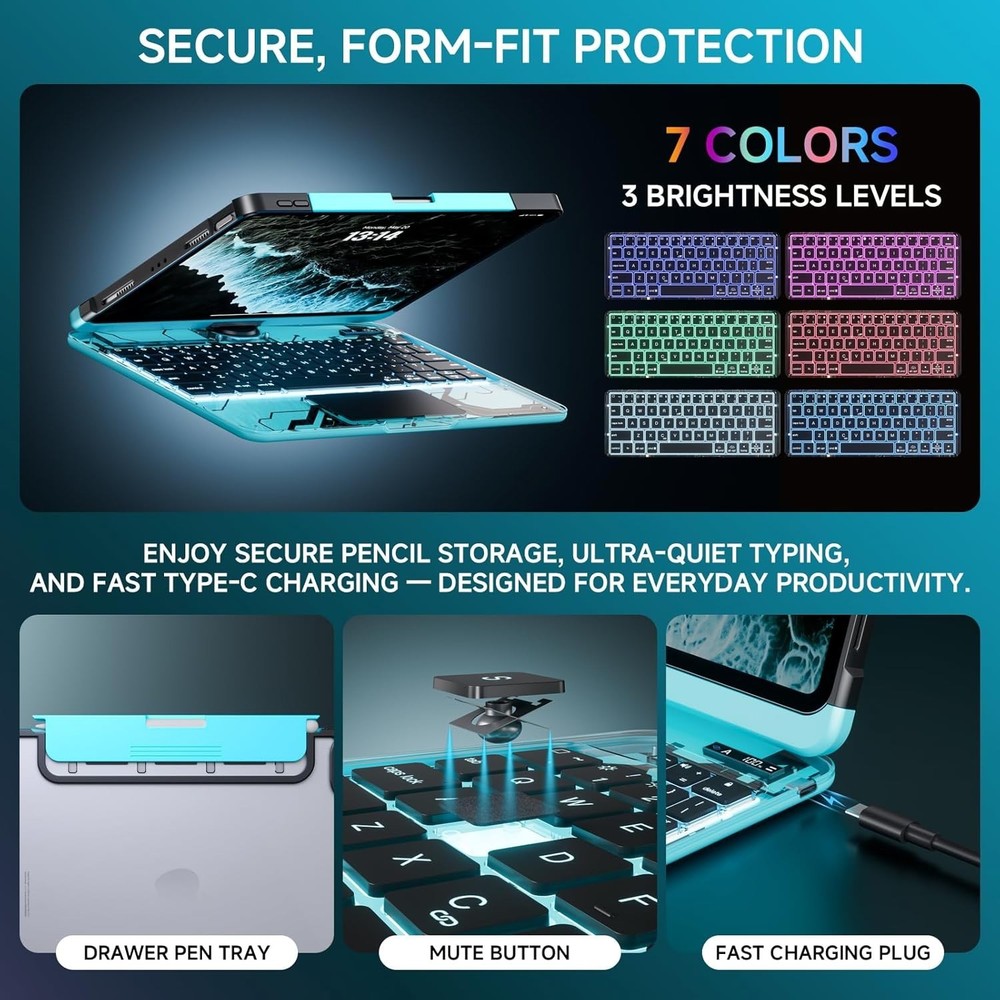Turn Your iPad into a Laptop in Seconds. Stop tapping on glass. The Novyke 360 Series transforms your iPad into a powerful productivity station. Whether you are typing a paper for class, sketching with your Pencil, or watching Netflix, the patented 360-degree hinge lets you find the perfect angle every time. Why People Choose This Over the "Magic" Brand: 360° Swivel & Flip: Unlike rigid keyboards, you can spin the screen around to share your work or fold it flat to use as a tablet without removing the case. Precision Trackpad: Navigate your iPad with full multi-touch gesture support. Scroll, swipe, and switch apps just like on a MacBook. Safe Pencil Storage: Built-in slot holds your Apple Pencil securely so it charges while you work (and never gets lost in your bag). Key Features: Laptop-Grade Typing: Scissor-switch keys provide a bouncy, tactile feel for fast, silent typing Shockproof Shell: Hard-shell back protects your iPad from drops, scratches, and bending. RGB Backlight: (Check if your model has this, usually they do) Type in the dark with adjustable brightness and breathing color modes. Long Battery Life: Type for weeks on a single charge with the auto-sleep/wake function. Compatibility (Select Your Model): iPad Pro 11-inch (All Generations) iPad Pro 12.9-inch (3rd, 4th, 5th, 6th Gen) iPad Air 4 / Air 5 iPad 10th Gen (10.9") What’s in the Box: 1x 360° Rotating Keyboard Case 1 (iPad and Pencil not included)