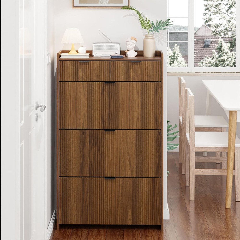 Product Description About this item • ARTISTIC DESIGN: The rattan art design adds a touch of elegance and sophistication to your home décor, making it a functional and stylish piece. With its unique shape and intricate weaving, this shoe cabinet is not only a storage solution but also a striking decorative accent. • SUPER STRONG AND MORE DURABLE: Our entry shoe cabinet is made of high quality MDF, and the non-slip rubber pads on the table legs provide greater stability and avoid scratching the floor. Smooth and eco-friendly coating is waterproof and easy to clean with a cleaning cloth. • PLENTY OF STORAGE SPACE: designed with a small drawer on the right side as well as a storage compartment on the lower right side. You can put umbrellas in it, providing ample storage space while keeping your shoes neatly organized and easy to access. • EASY TO ASSEMBLE: Easily assemble this shoe cabinet! (Approx. 30 minutes) . Assembly instructions and assembly tools are included, easy to install with illustrated instructions. • AFTER-SALES SERVICE: If you have any questions about the rattan shoe cabinet with the door, please feel free to contact us. We will reply to you as soon as possible within 24 hours. On Aug 12, 2025 at 00:30:26 PDT, seller added the following information: