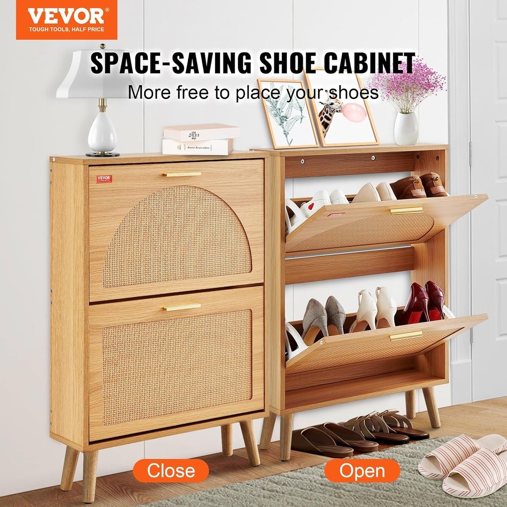 About this product: Wooden Smart Shoe Cabinet Storage Solution: Featuring an innovative, space-saving design, our shoe cabinet allows you to easily access your shoes while keeping them neatly organized when not in use, maintaining a tidy entryway. Ample Storage Space: Two flip-up drawers maximize storage space. Compared to other shoe cabinets of the same size, it can accommodate more different styles of shoes, including heels and ankle boots. Simple and Versatile Design: This entryway shoe cabinet features a classic white finish, solid wood legs, and aluminum handles. Its simple and stylish design perfectly complements various home décor styles, enhancing overall harmony and aesthetics. High Quality and Durability: This shoe cabinet with drawers is crafted from premium materials, with side and back panels thickened to 15mm/0.59 inches, significantly improving stability and durability. On Nov 3, 2025 at 02:25:06 PST, seller added the following information: