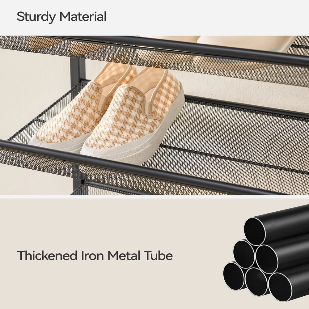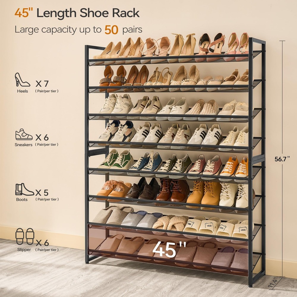 Are you tired of tripping over your shoes every time you walk into your house? Look no further! Our shoe rack is here to save the day (and your precious toes) with its amazing features and functionality. With a length of 45 inches, this shoe rack is designed to accommodate a whopping 48 pairs of shoes! That's right, no more messy piles of sneakers, boots, and heels scattered across your floor. Finally, a place for every shoe! Say hello to a clutter-free and organized home with our Shoe Rack Organizer Storage Shelf. Don't miss out on the opportunity to revolutionize your shoe storage game! SUPER-SIZED CAPACITY: Sized at 11.4" x 45" x 56.7",Our 8-tier shoe rack can max hold up to 50 pairs of shoes, providing ample storage space for your entire shoe collection. VERSATILE USAGE: This shoe organizer can be stacked into an 8-tier structure or separated into two 4-tier racks, allowing you to customize it according to your needs. CHOICE OF INSTALLATION: The flat mesh design is perfect for storing miscellaneous items, while the slanted mesh is ideal for securely storing shoes, ensuring they won't slip off easily. SECURE AND STURDY: The tightly woven mesh prevents shoes from falling through, and the sturdy metal frame guarantees excellent weight-bearing capacity. PERFECT FOR ANY SPACE: Whether you place it in your entryway, walk-in closet, or basement garage, this storage shelf will keep your shoes organized and easily accessible.